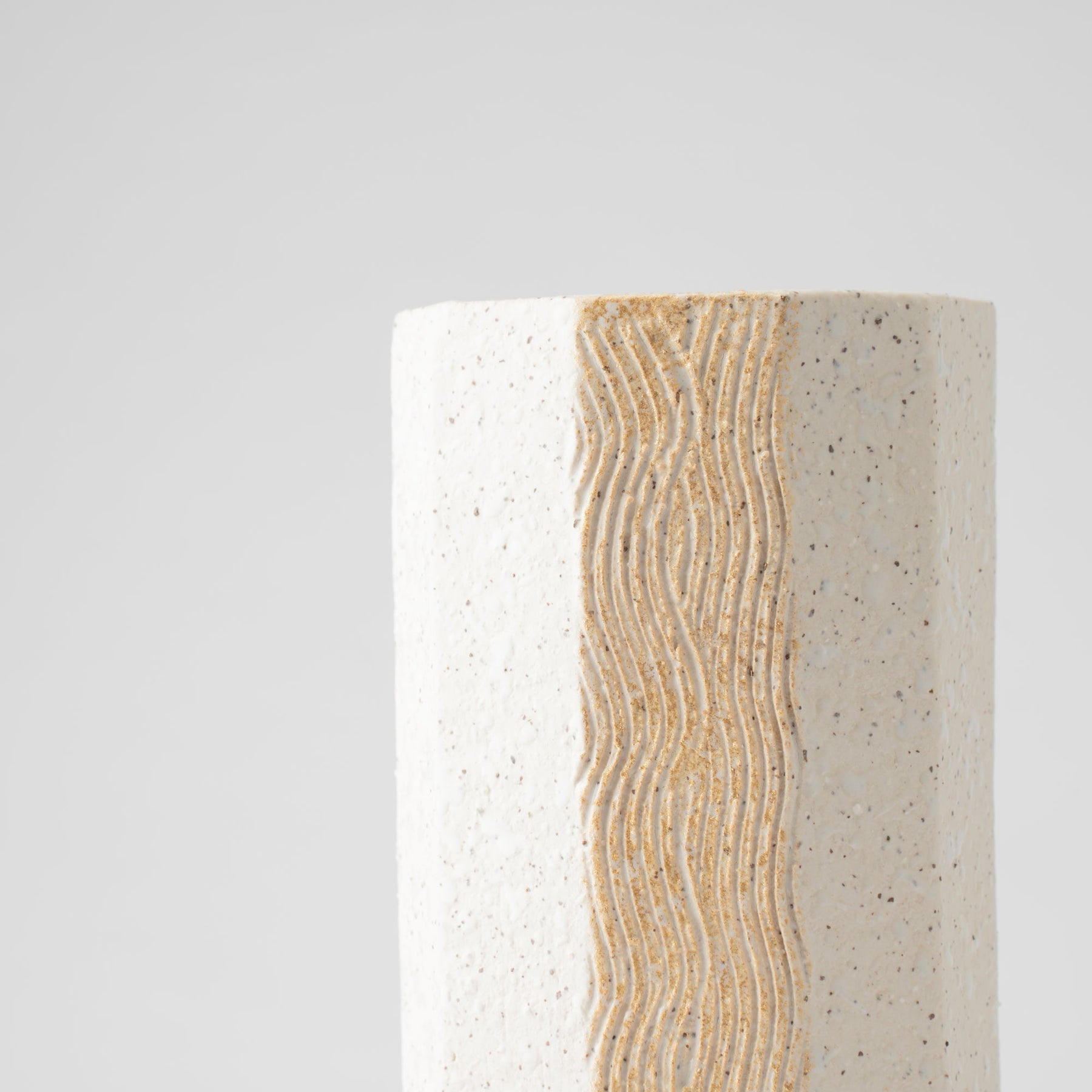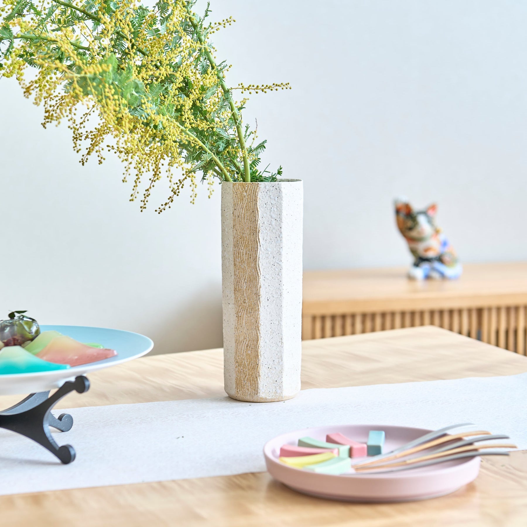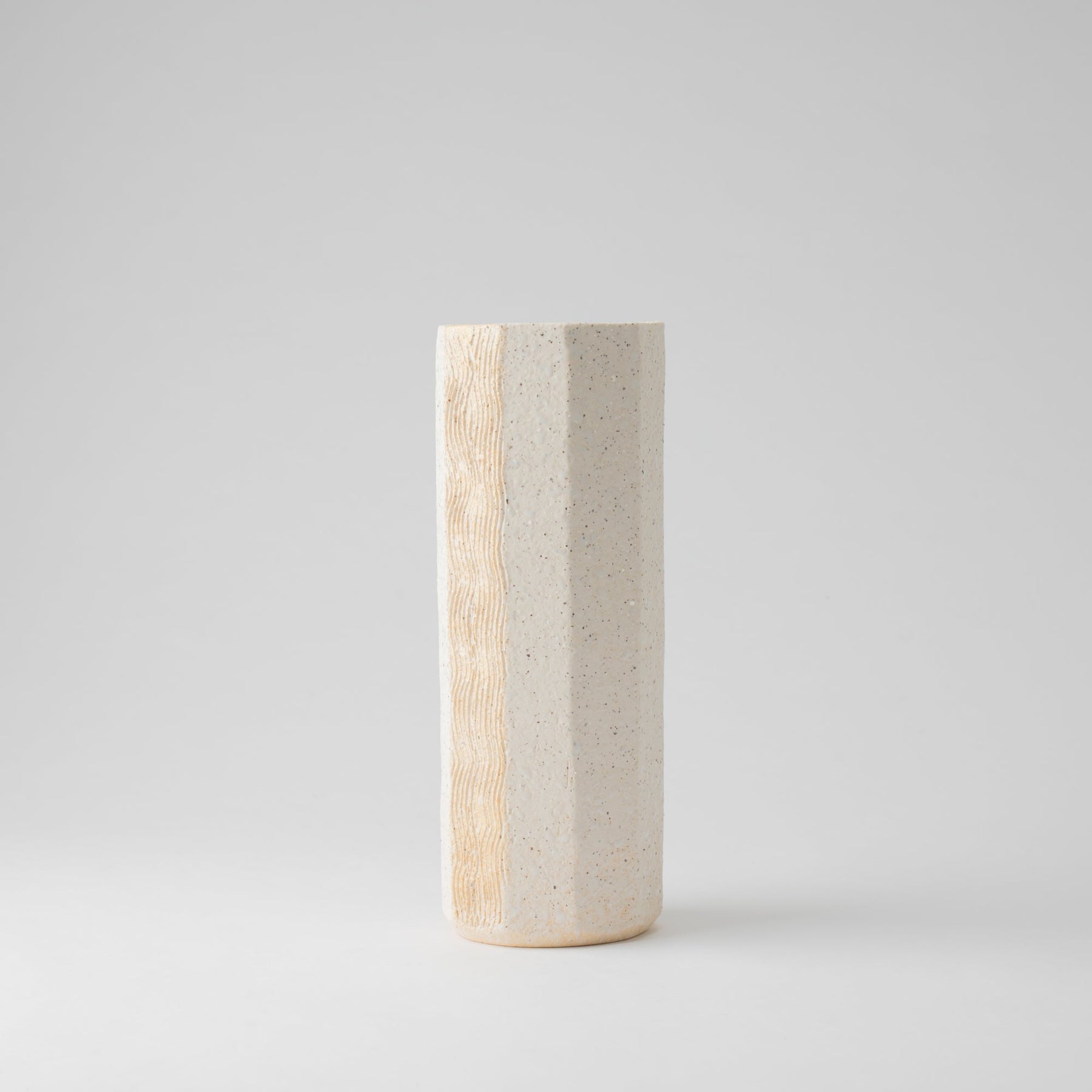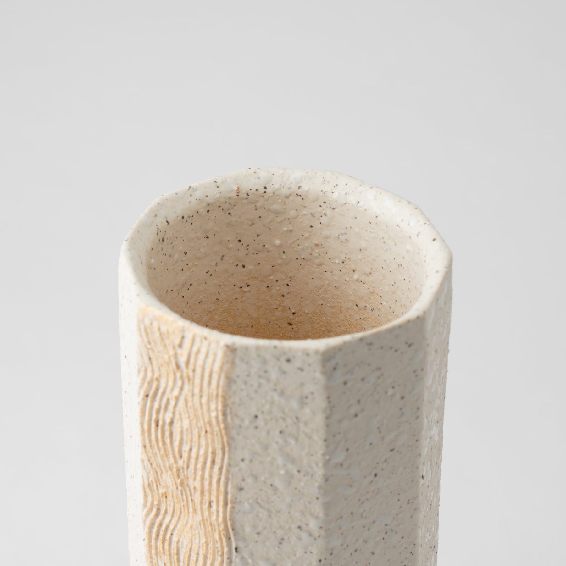 This is a Shigaraki ware vase with a white decagonal shape. The white glaze mixed with sand is layered on top of the white ceramic clay, giving it a rustic taste. One side of the vase is carved with a wavy pattern and decorated with gold glaze, giving it a sophisticated feel.