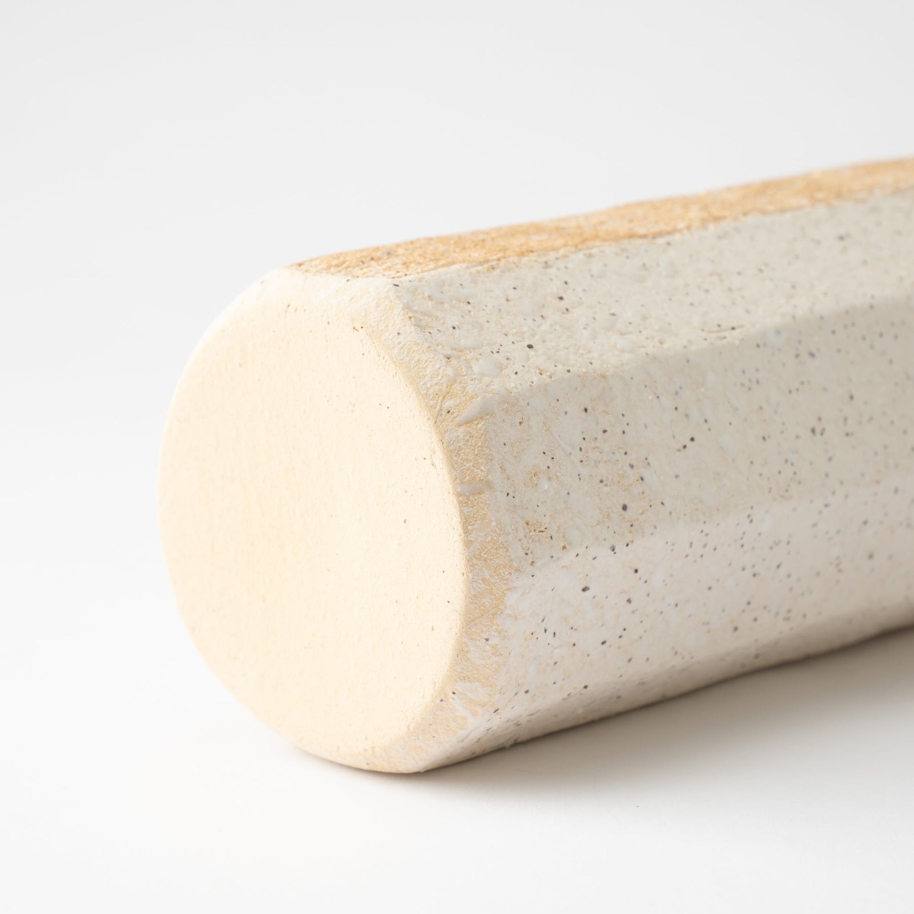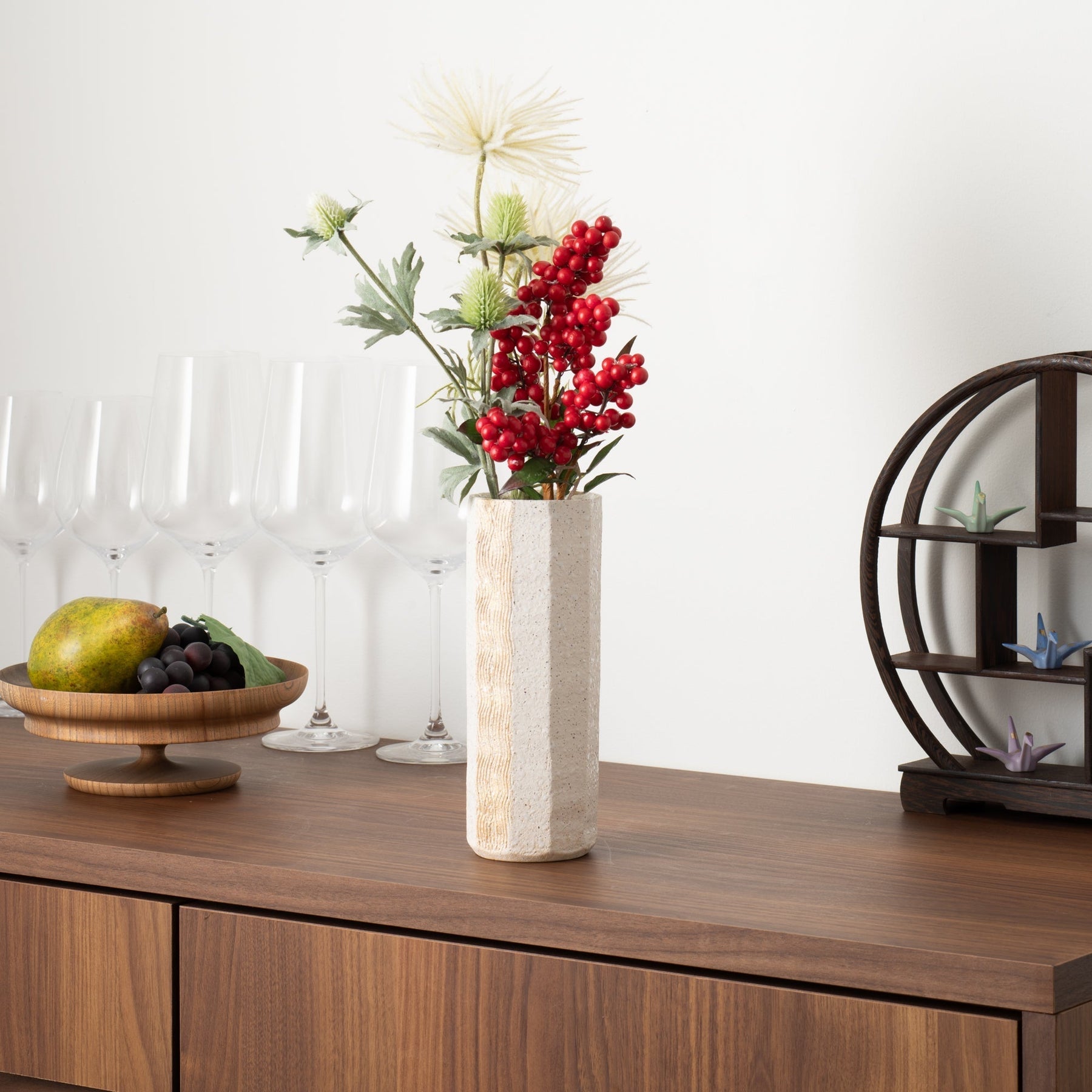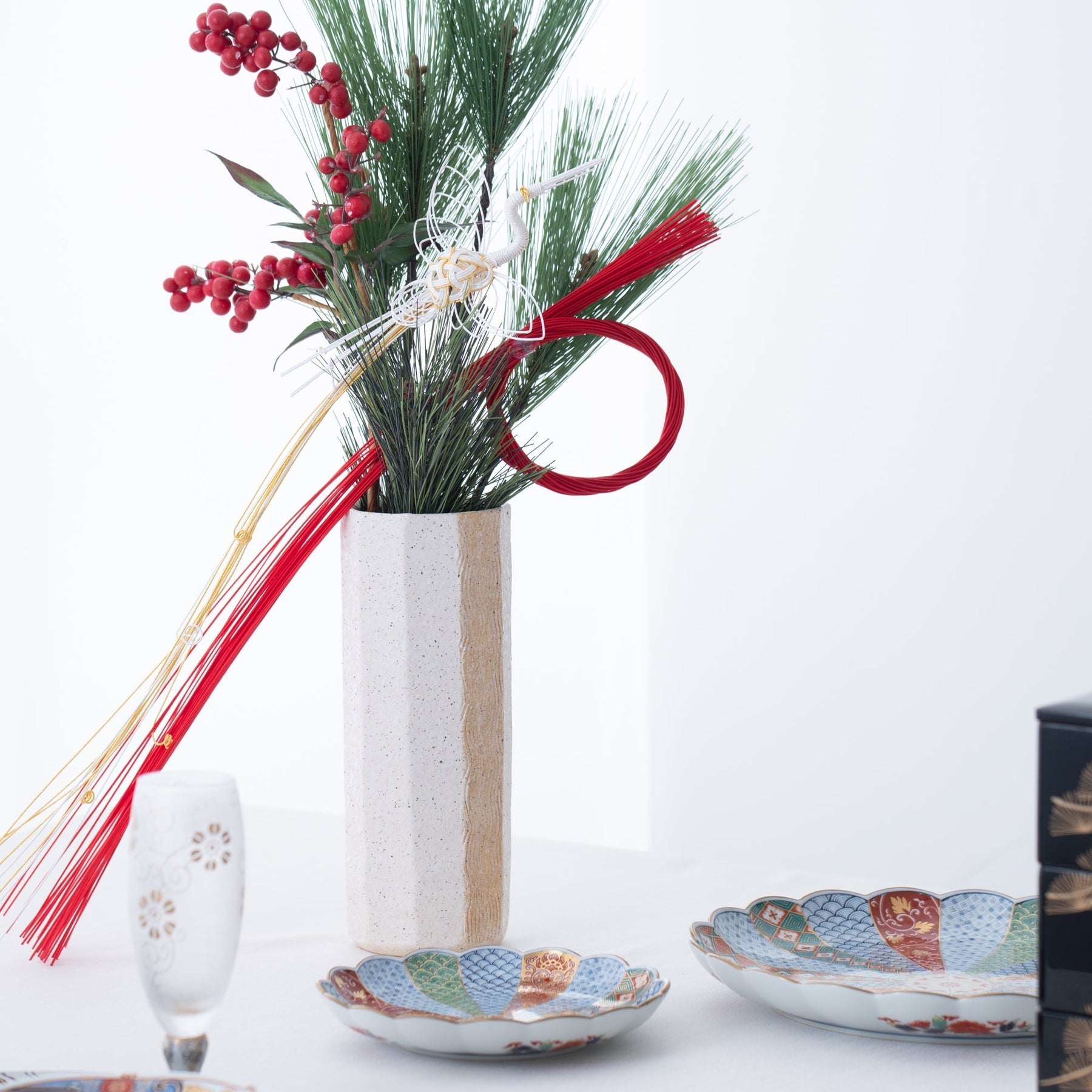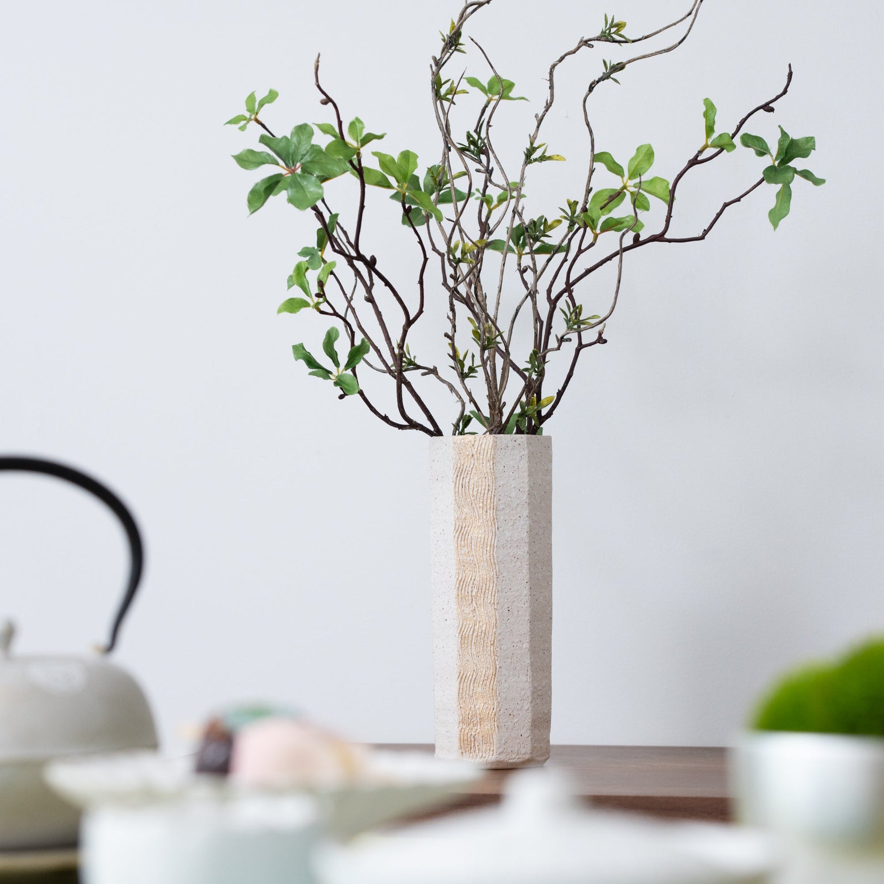 This is a Shigaraki ware vase with a white decagonal shape. The white glaze mixed with sand is layered on top of the white ceramic clay, giving it a rustic taste. One side of the vase is carved with a wavy pattern and decorated with gold glaze, giving it a sophisticated feel.