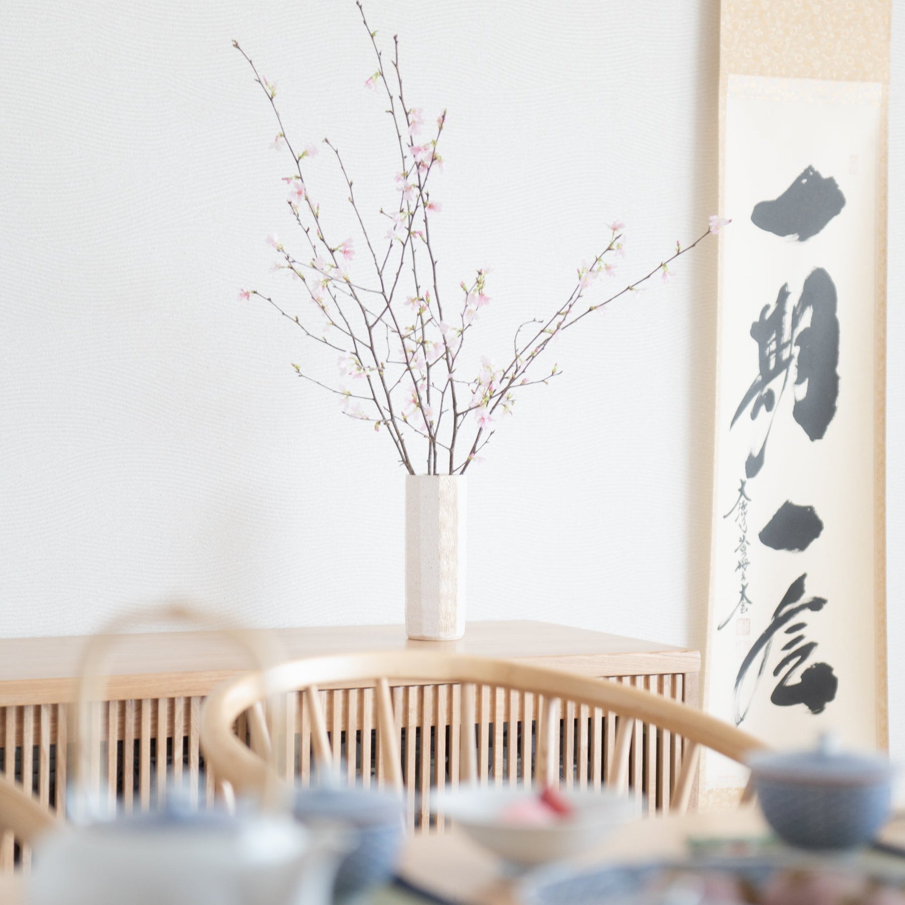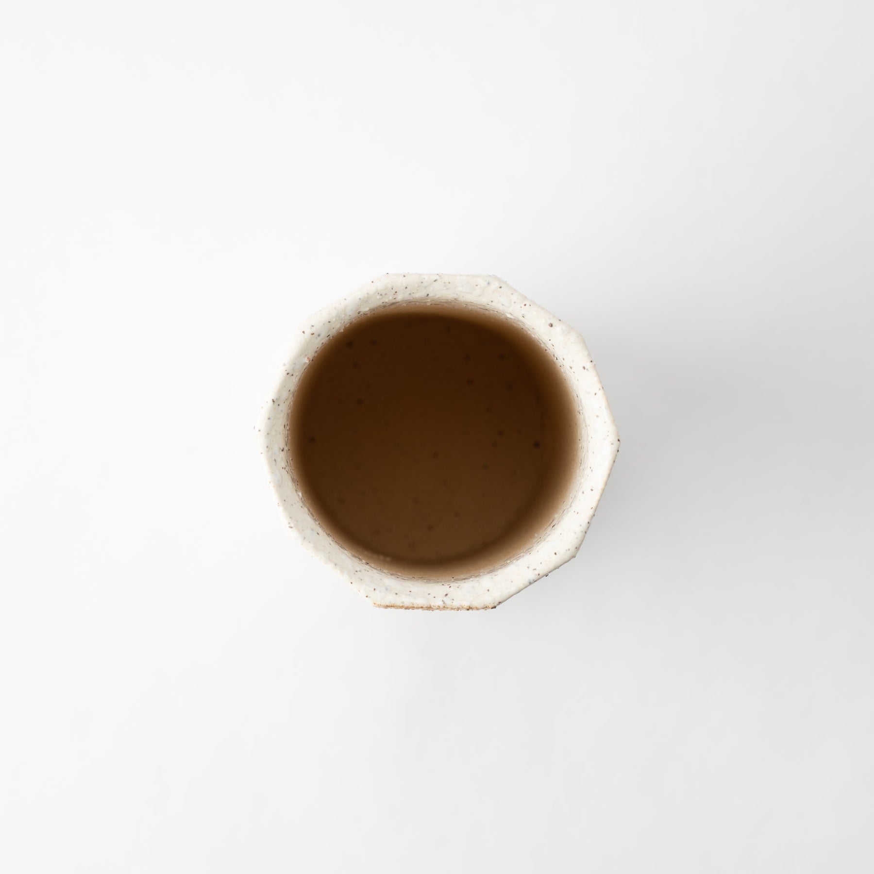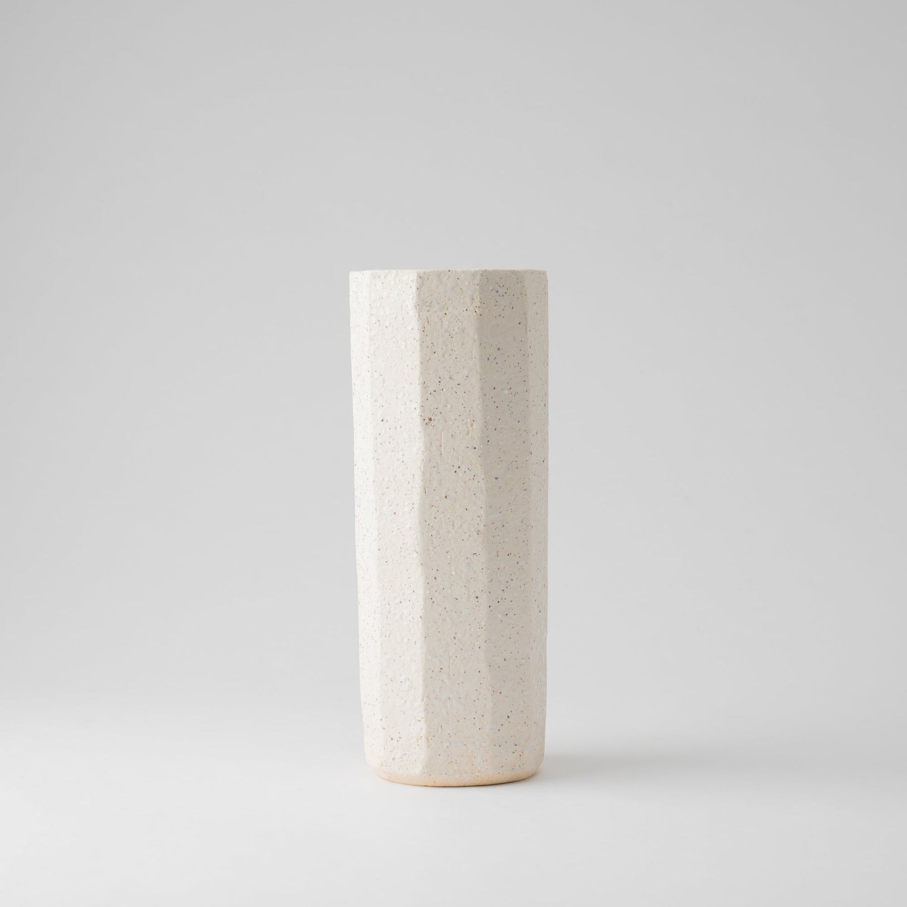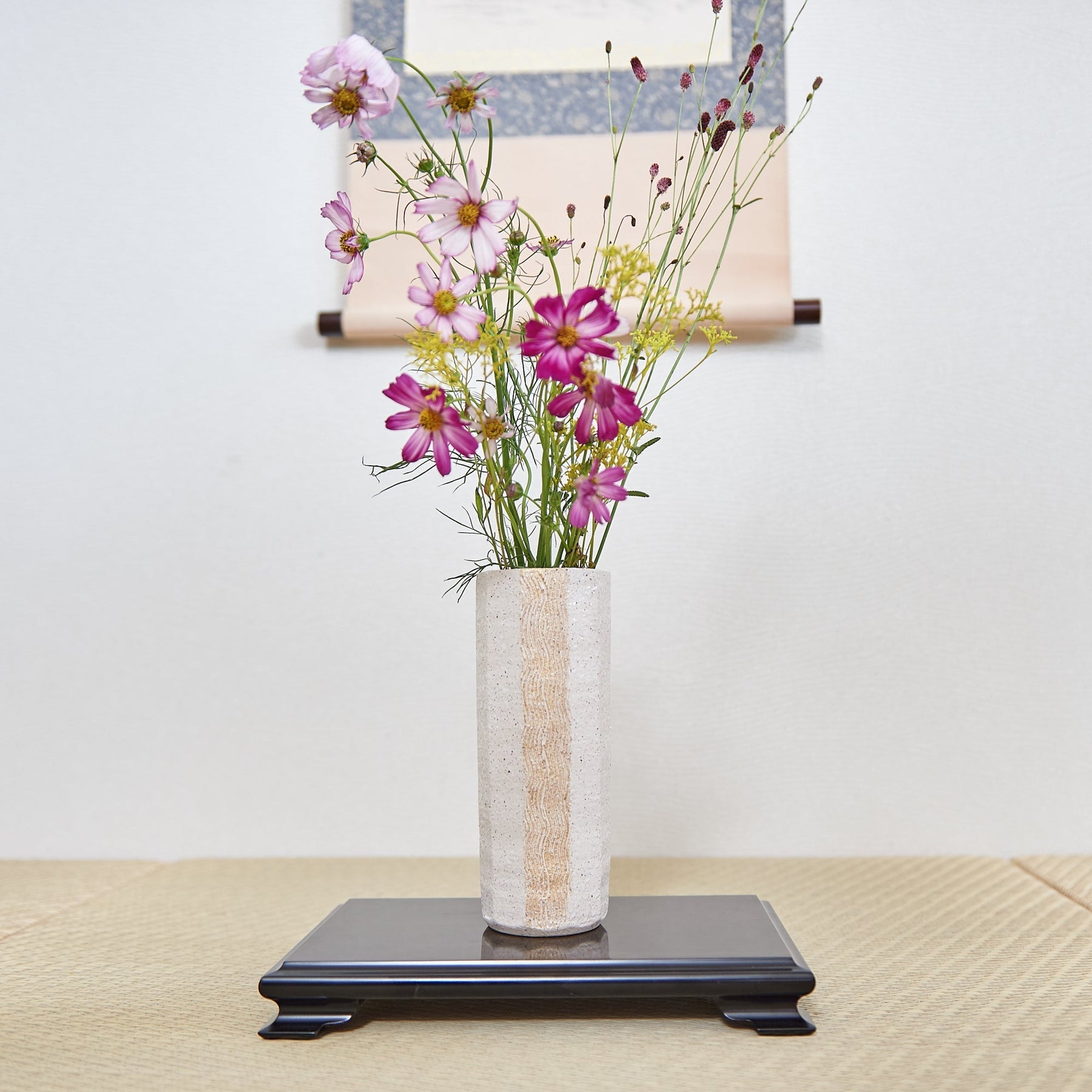 This is a Shigaraki ware vase with a white decagonal shape. The white glaze mixed with sand is layered on top of the white ceramic clay, giving it a rustic taste. One side of the vase is carved with a wavy pattern and decorated with gold glaze, giving it a sophisticated feel.
