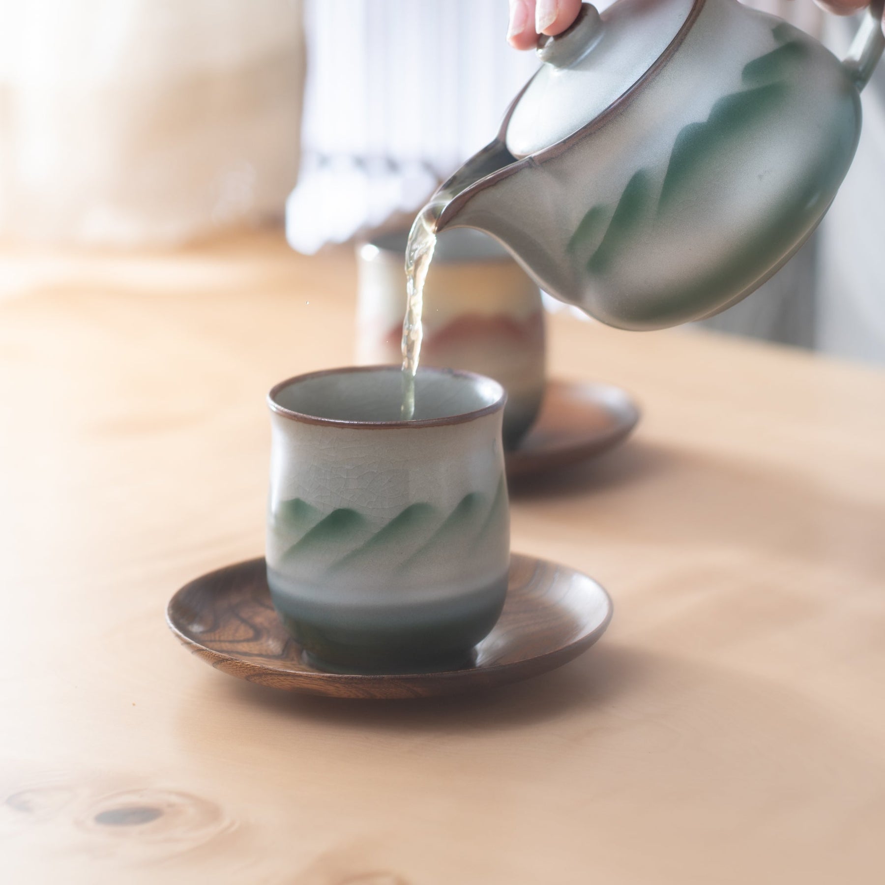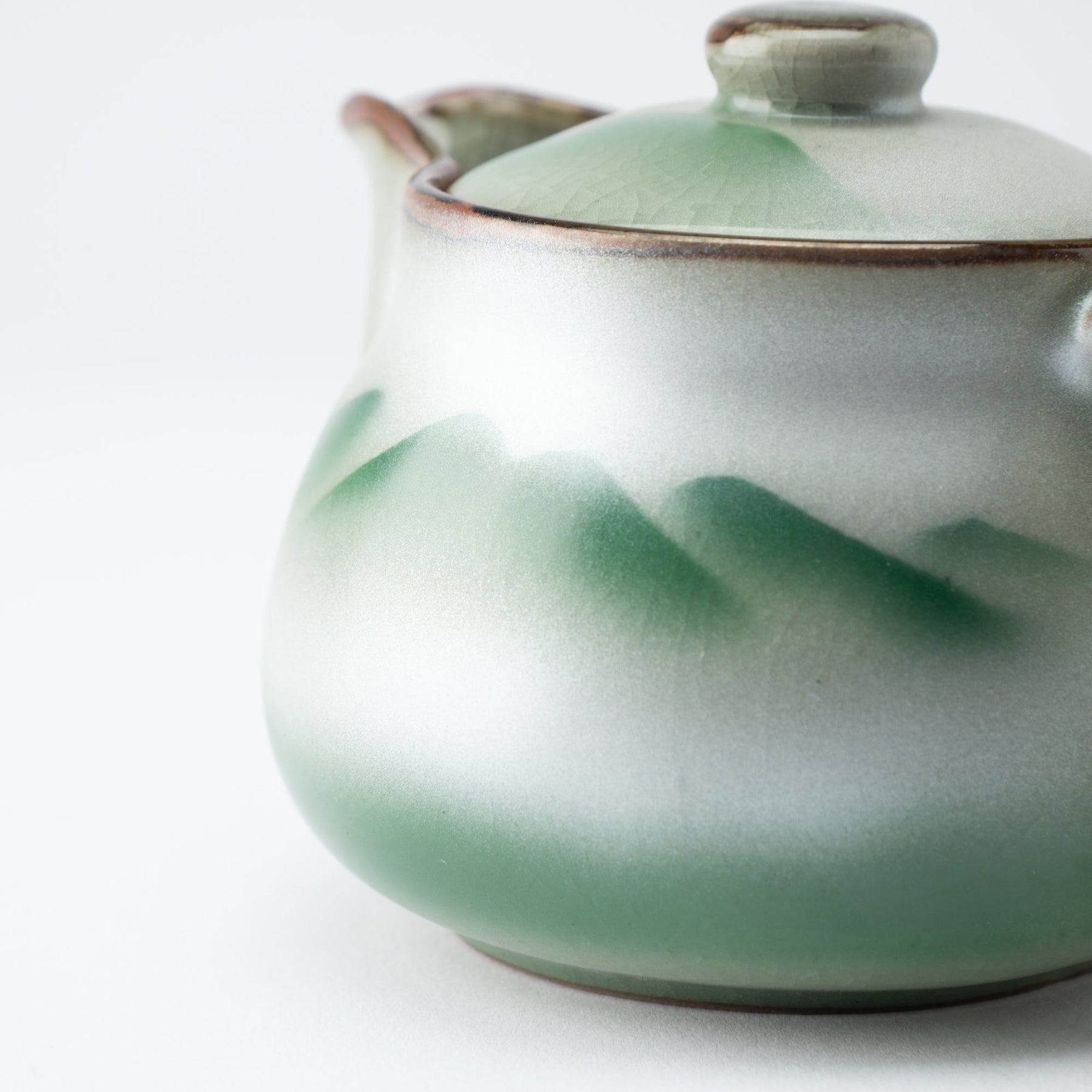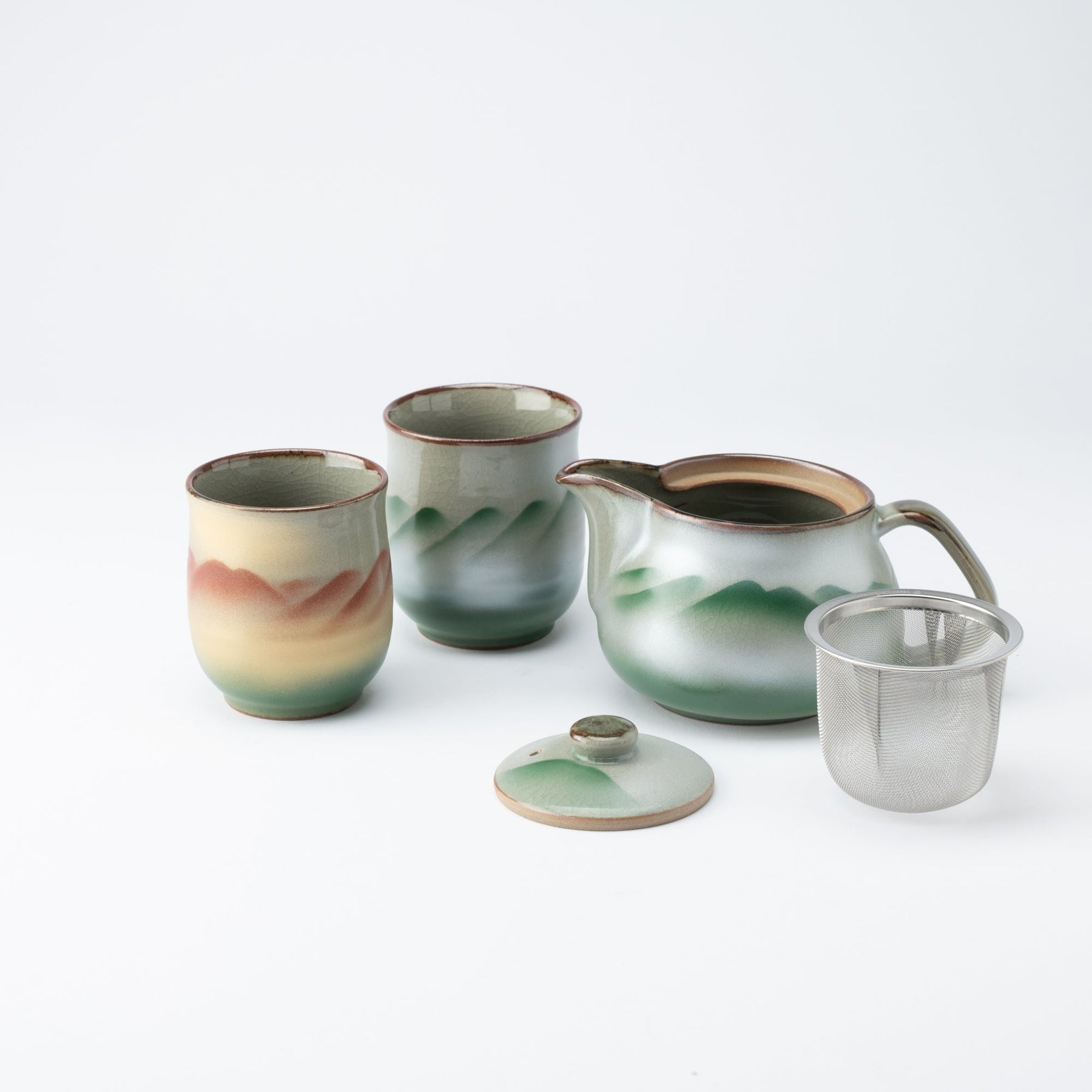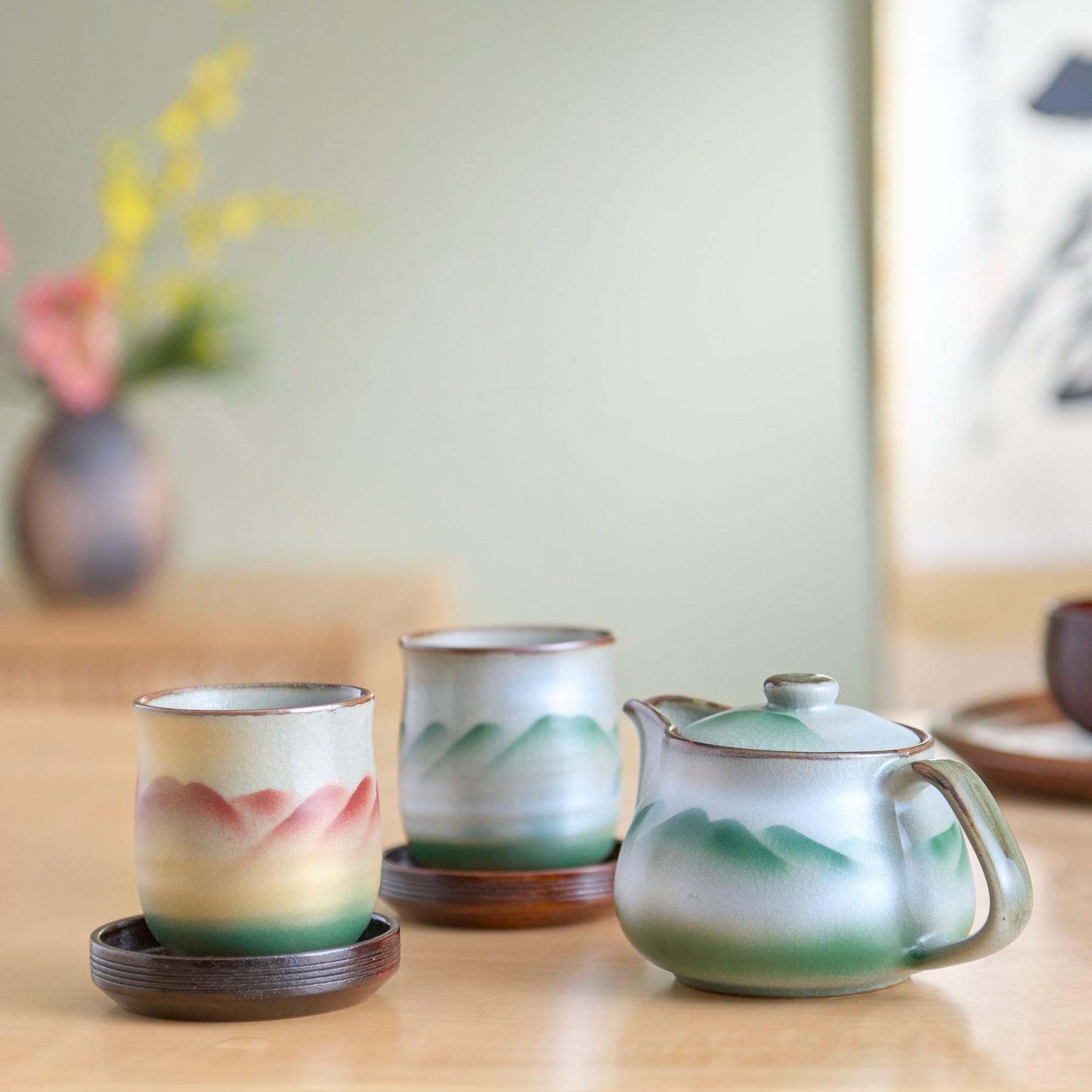 This exquisite ceramic Japanese teapot set showcases the renzan "mountain range" design. Its soft color palette, accented with subtle gold touches, captures the ethereal beauty of a distant landscape shrouded in haze.