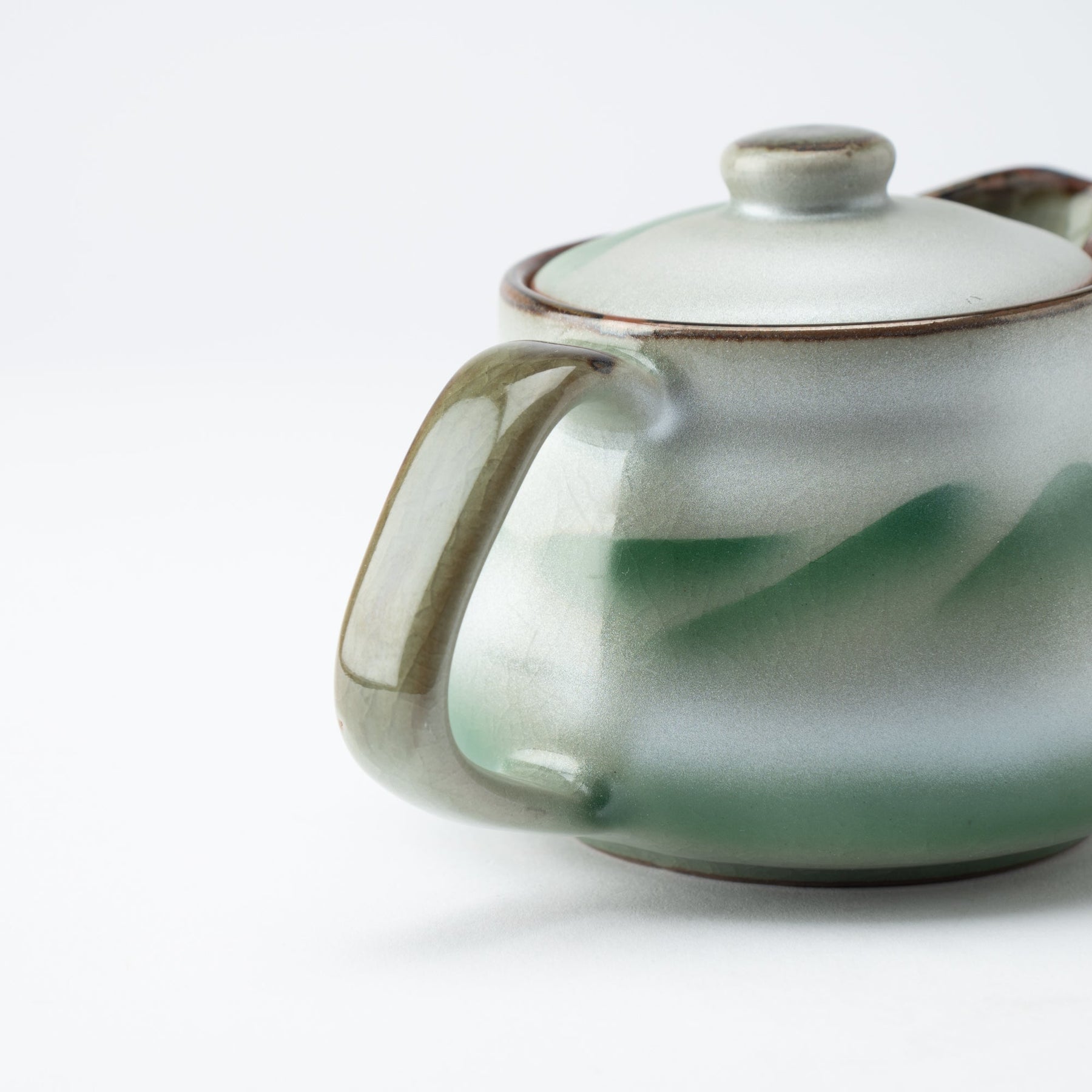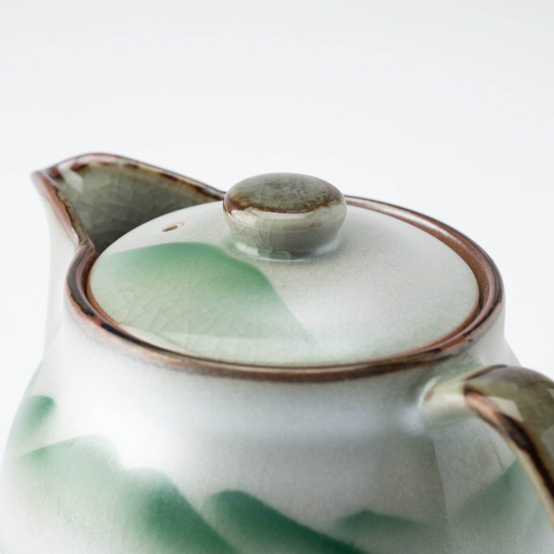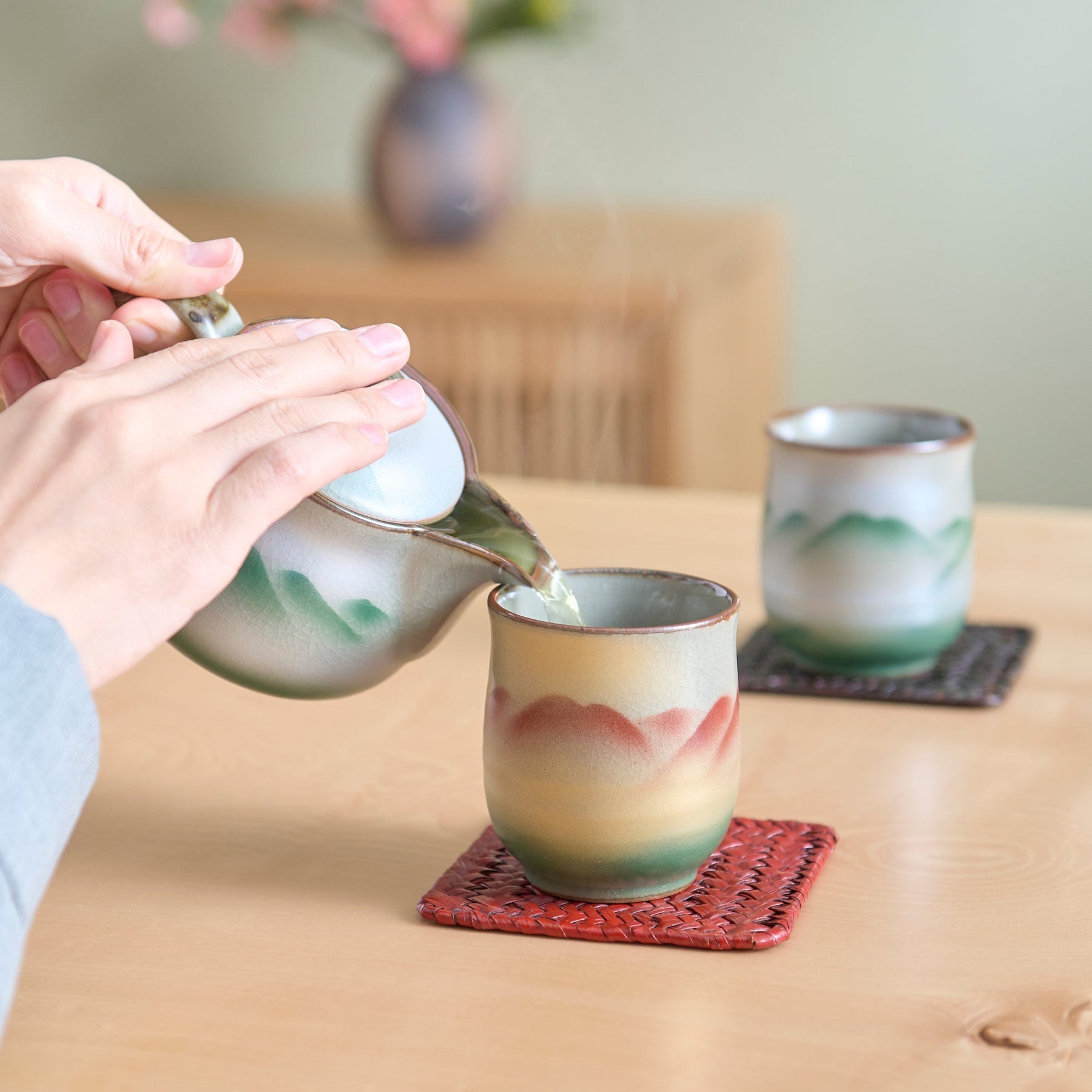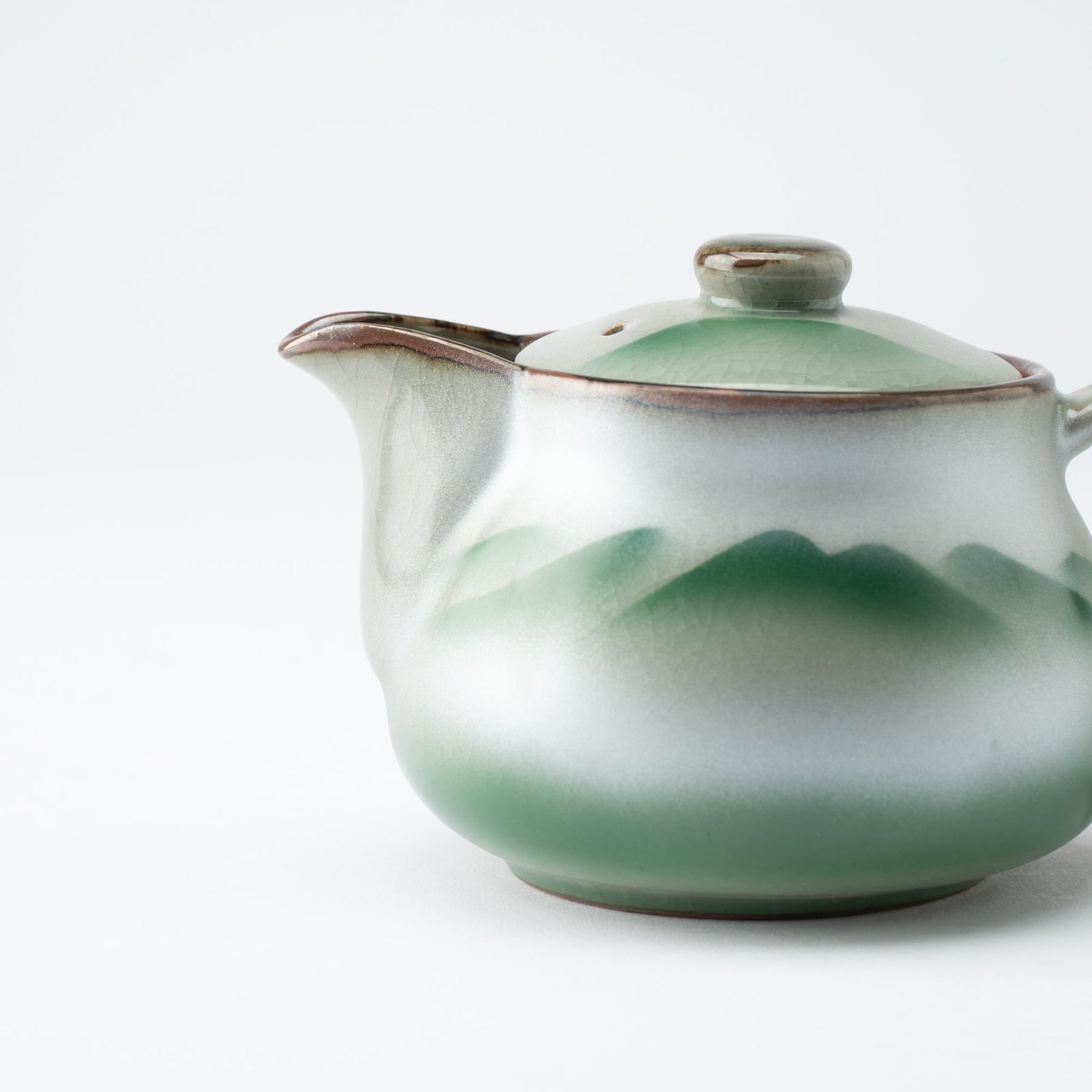 This exquisite ceramic Japanese teapot set showcases the renzan "mountain range" design. Its soft color palette, accented with subtle gold touches, captures the ethereal beauty of a distant landscape shrouded in haze.