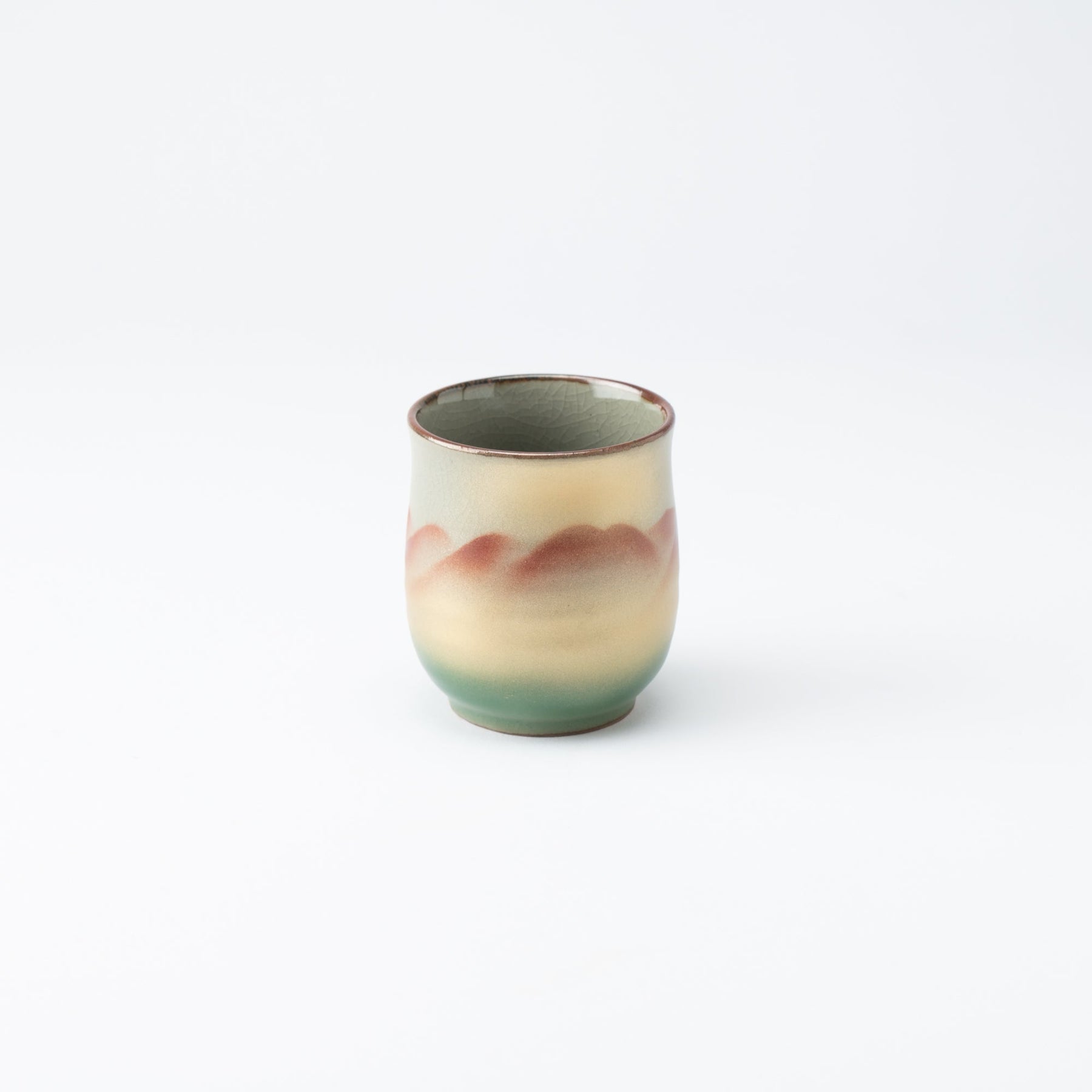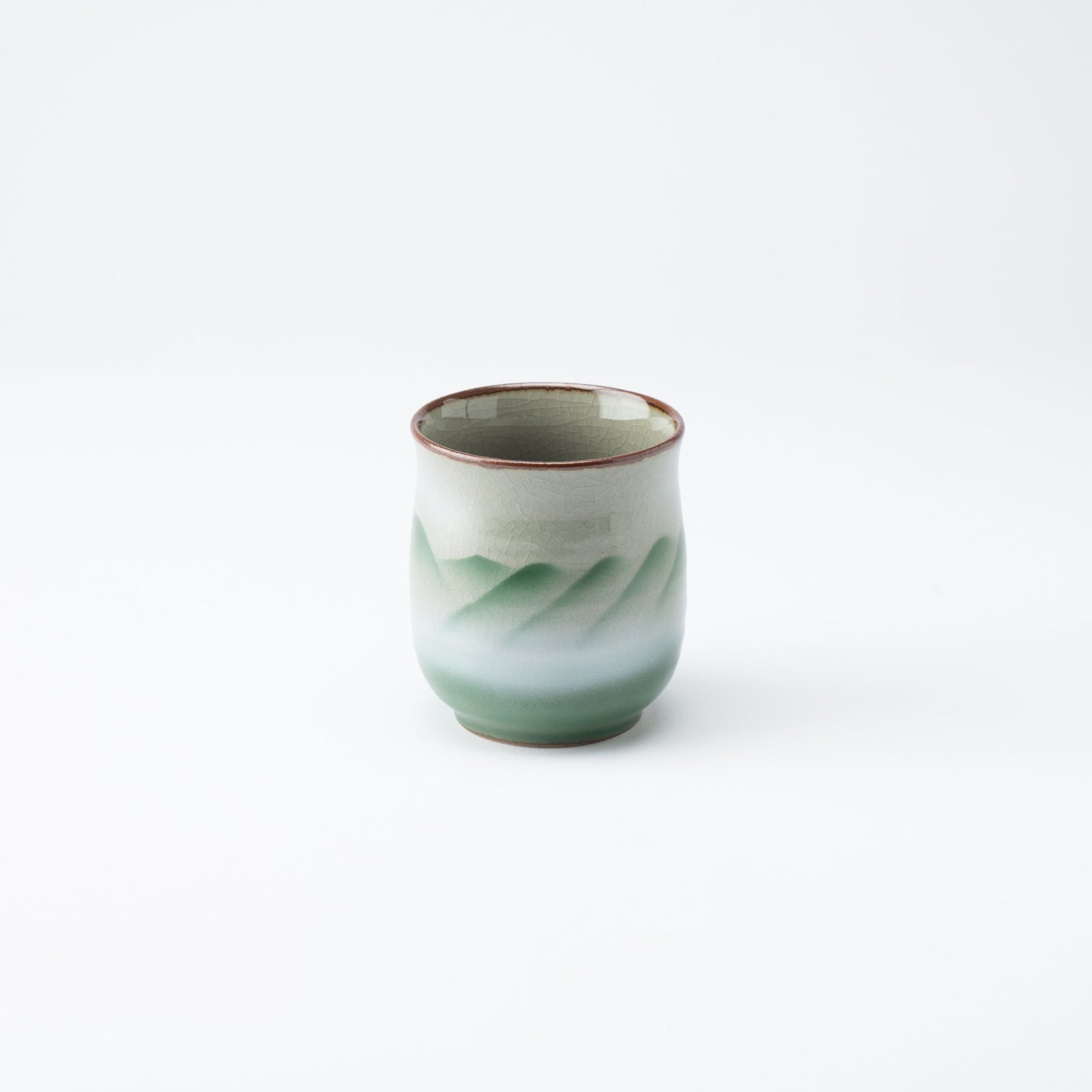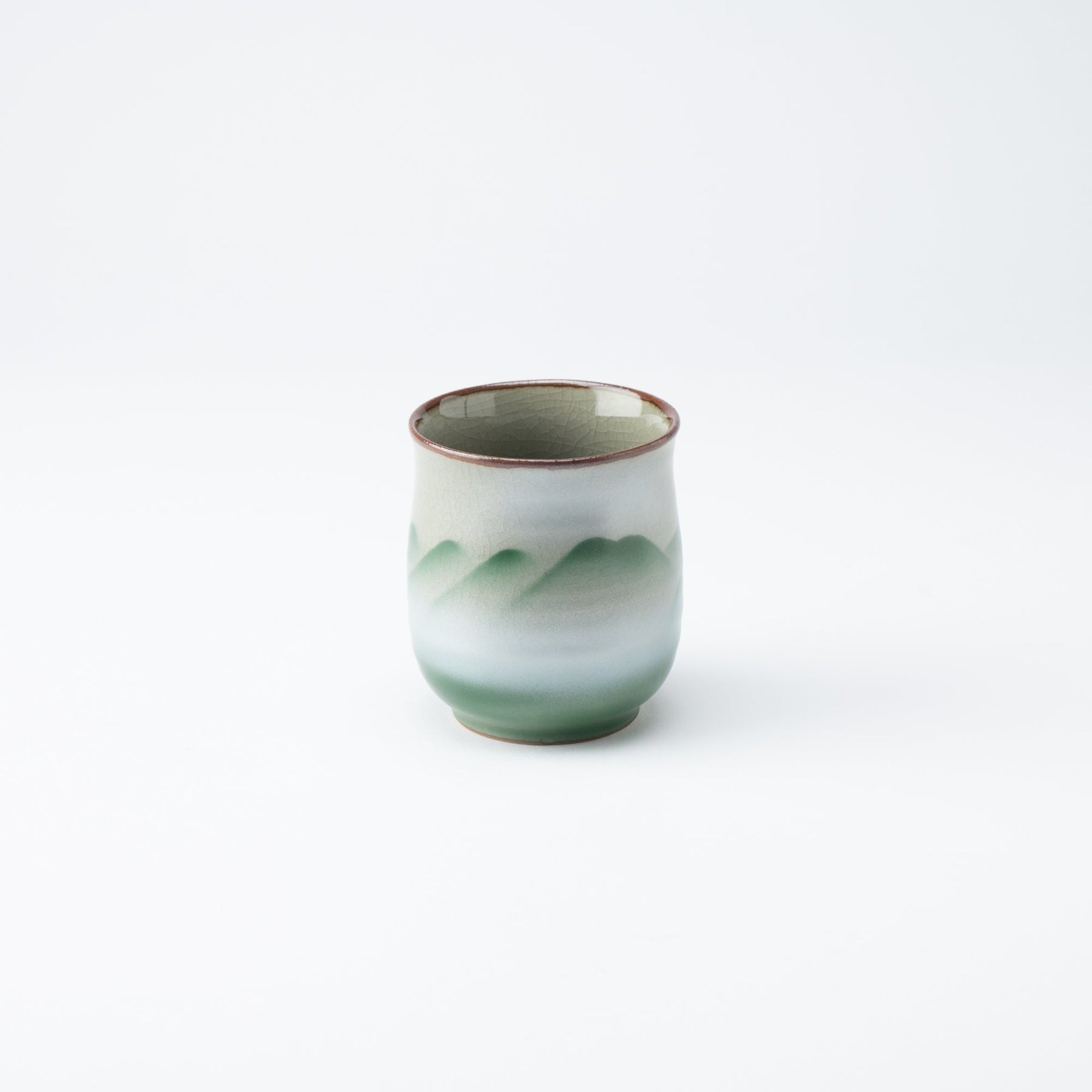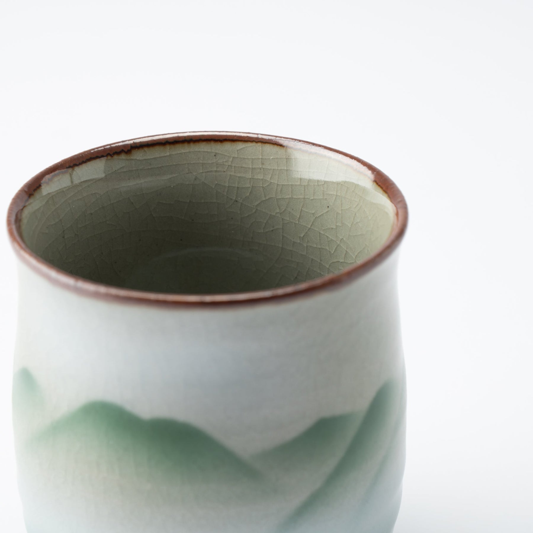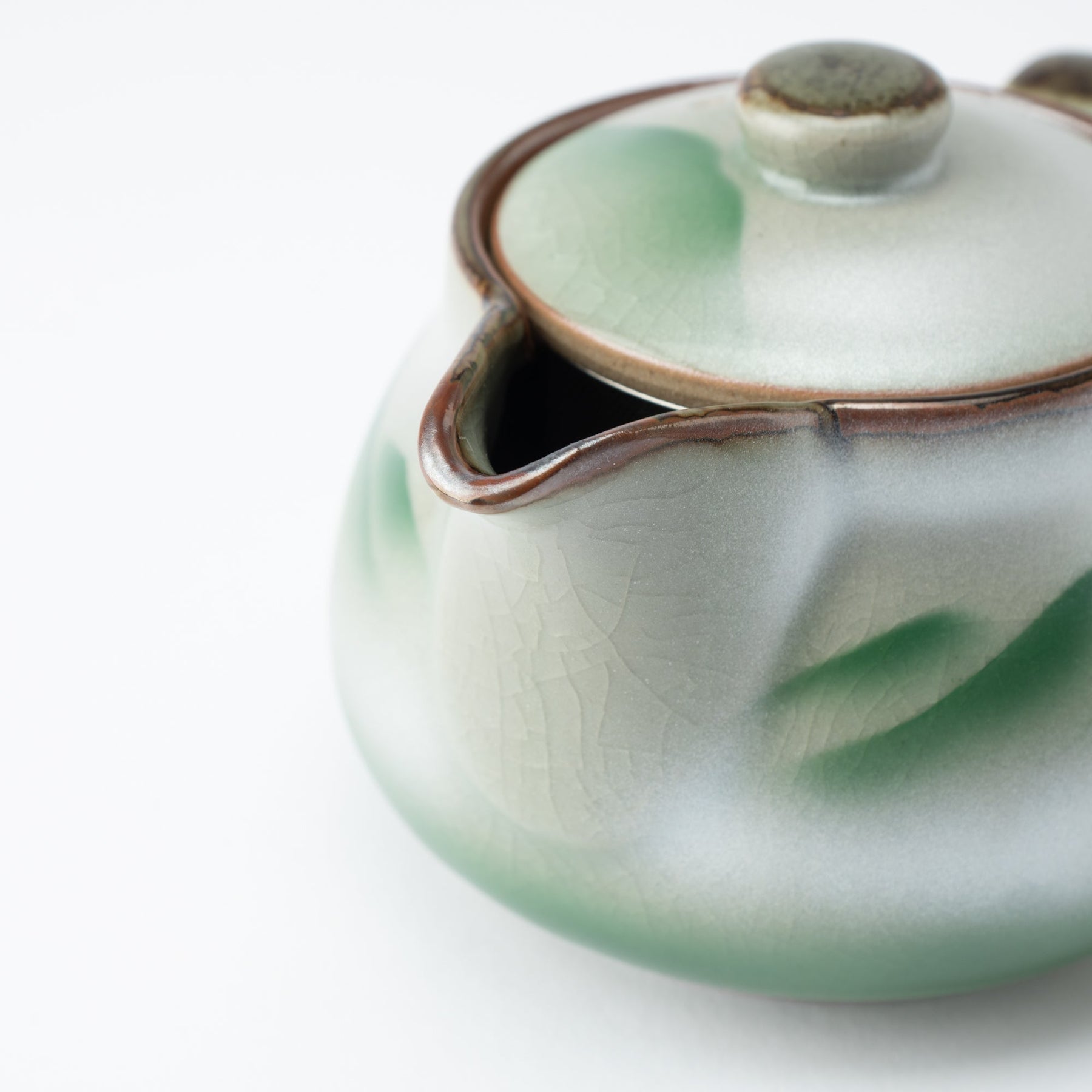 This exquisite ceramic Japanese teapot set showcases the renzan "mountain range" design. Its soft color palette, accented with subtle gold touches, captures the ethereal beauty of a distant landscape shrouded in haze.
