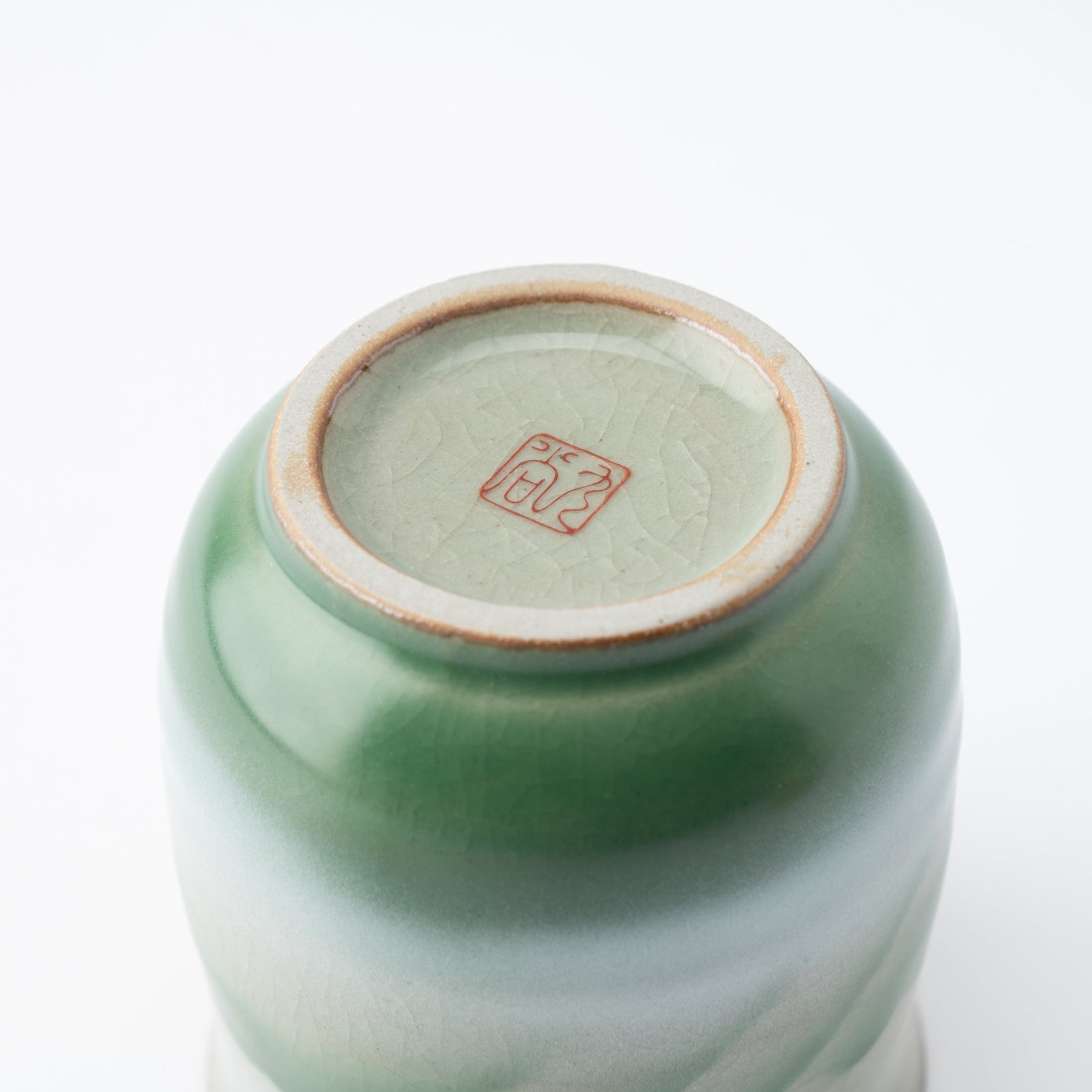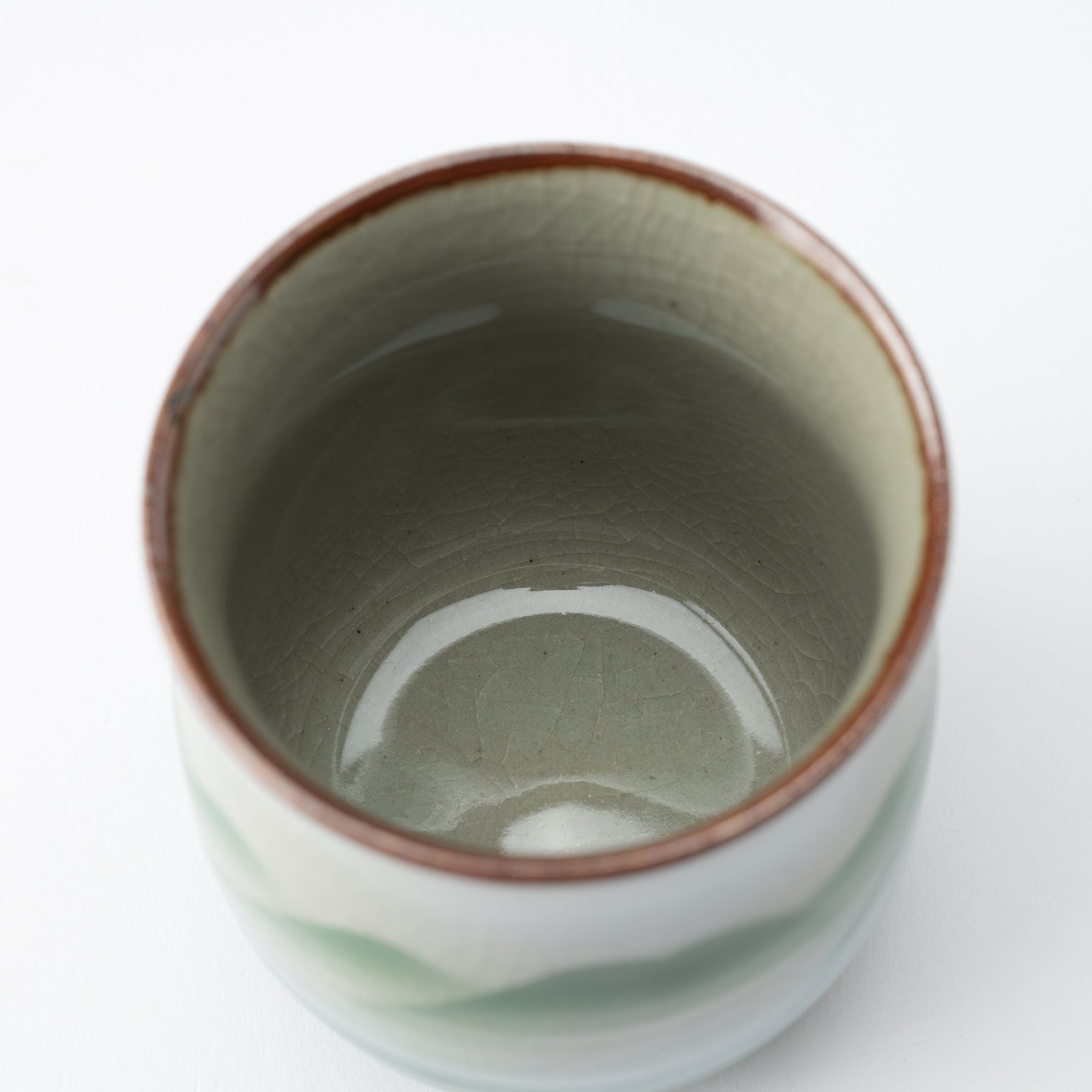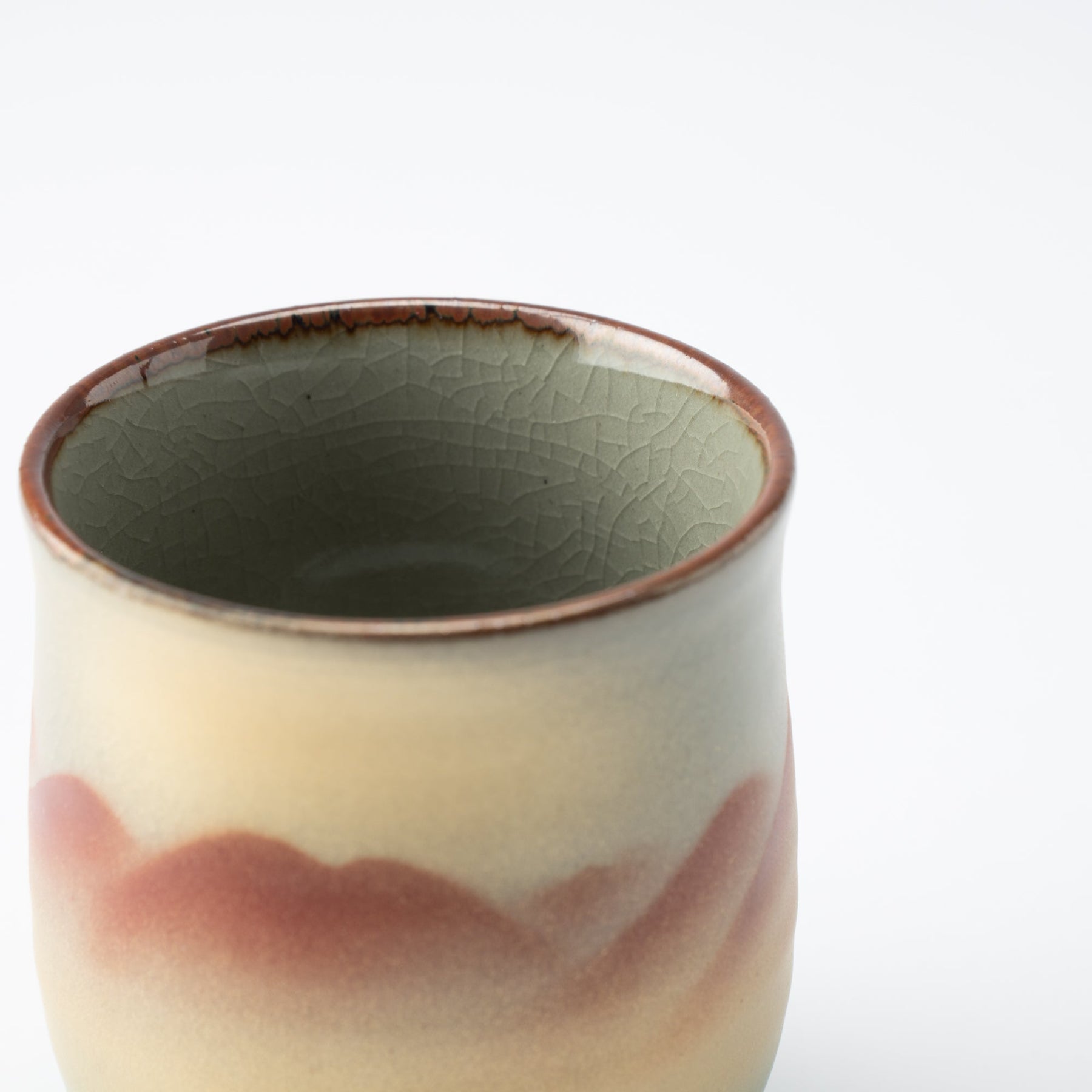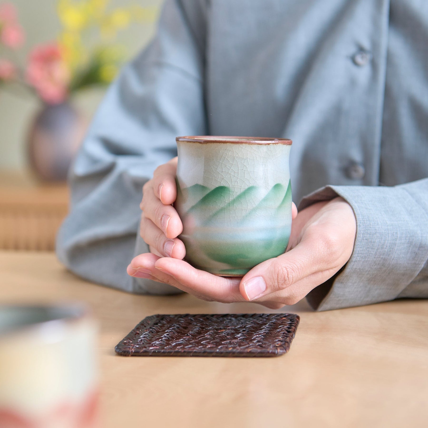 This exquisite ceramic Japanese teapot set showcases the renzan "mountain range" design. Its soft color palette, accented with subtle gold touches, captures the ethereal beauty of a distant landscape shrouded in haze.