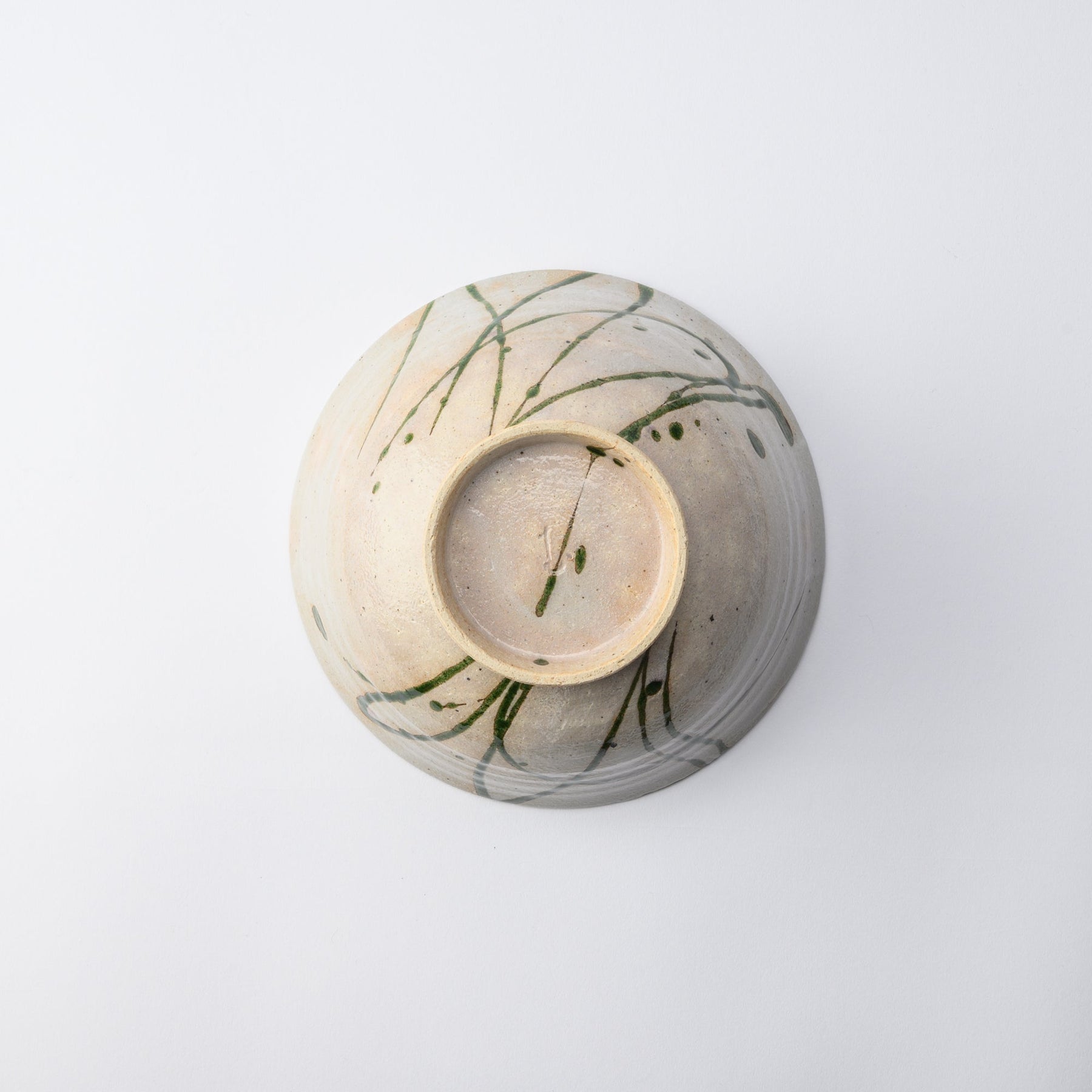 This donburi fascinates with its elegant water plant motif, highlighted with brown splashes. The green glaze and abstract brushstrokes are characteristic of Yashichida Oribe ware.