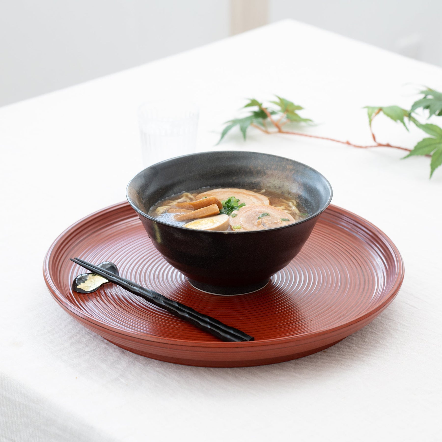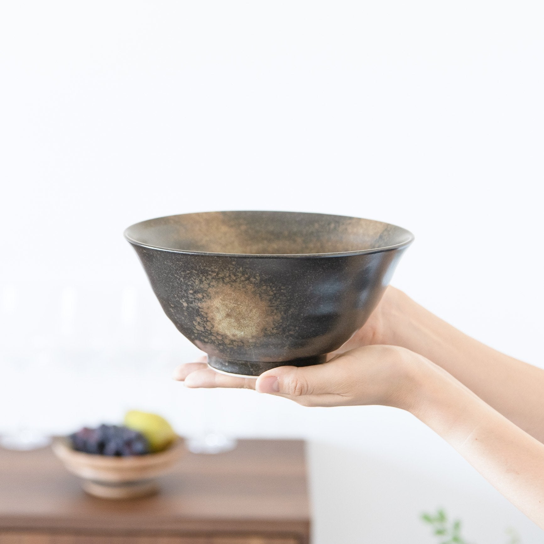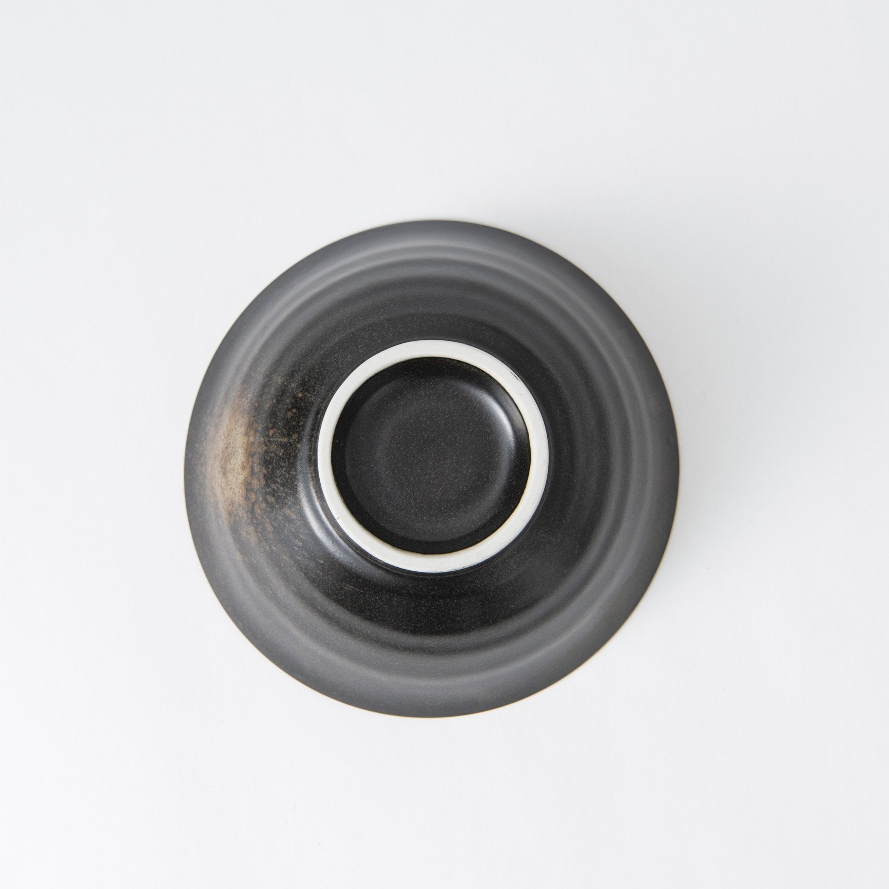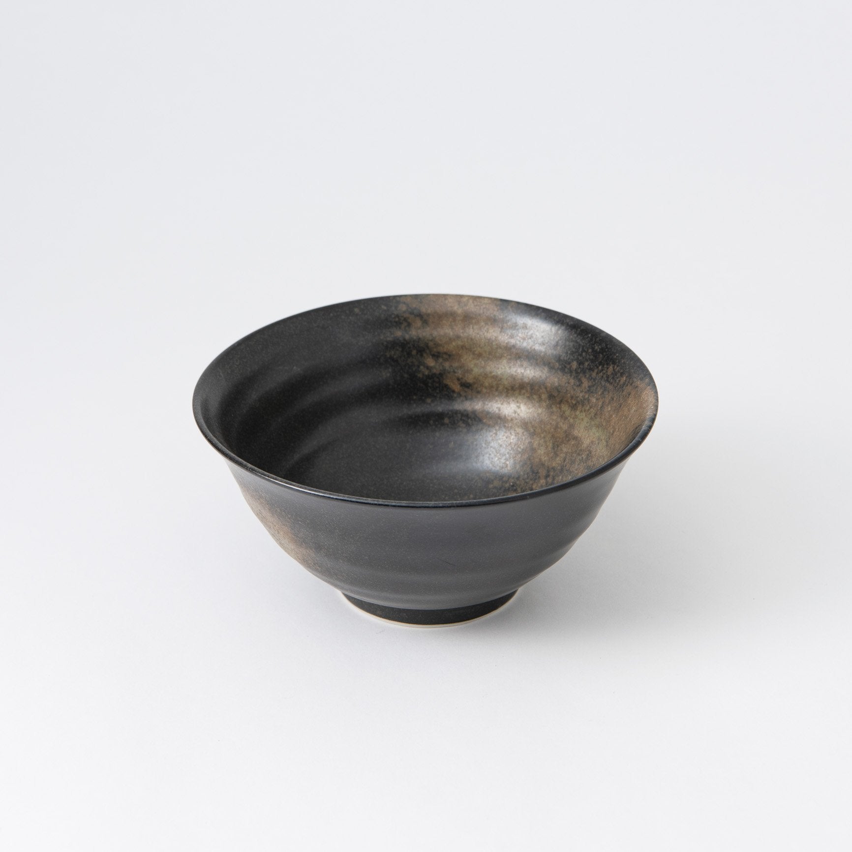 This regular-sized mino ware ramen bowl features an elegant design with light brown circular patterns set against a black background, representing the moon and its gentle glow in the night sky. The overall look is chic and exudes a sense of refinement.