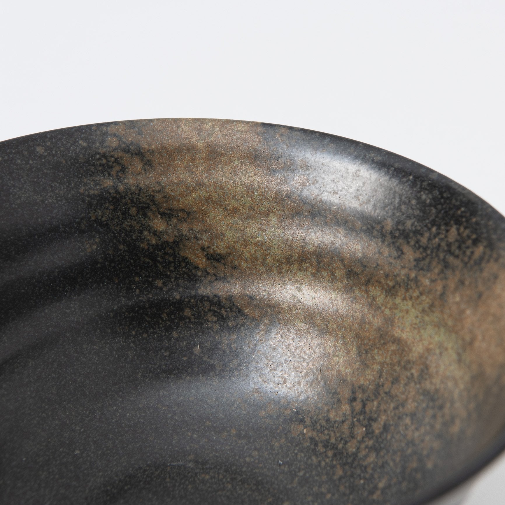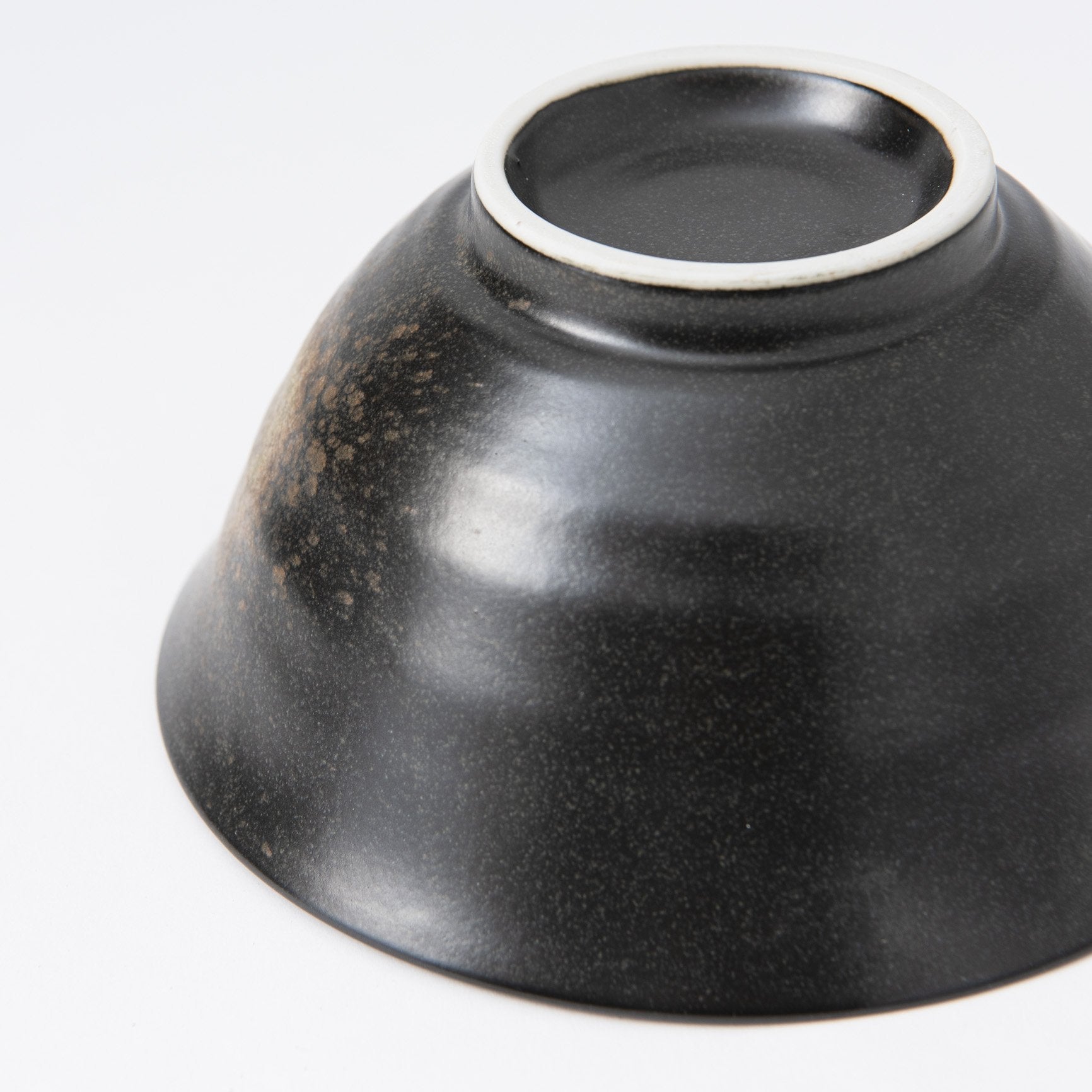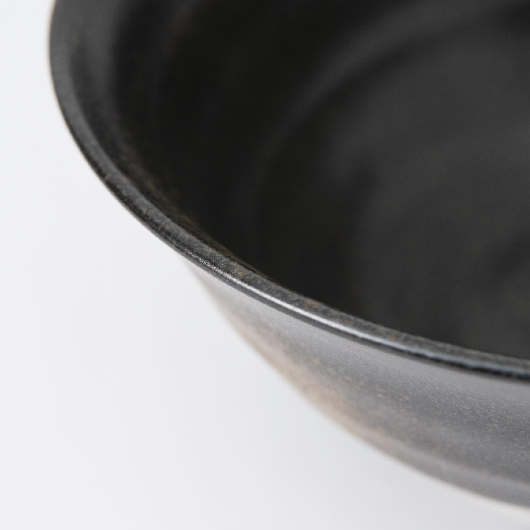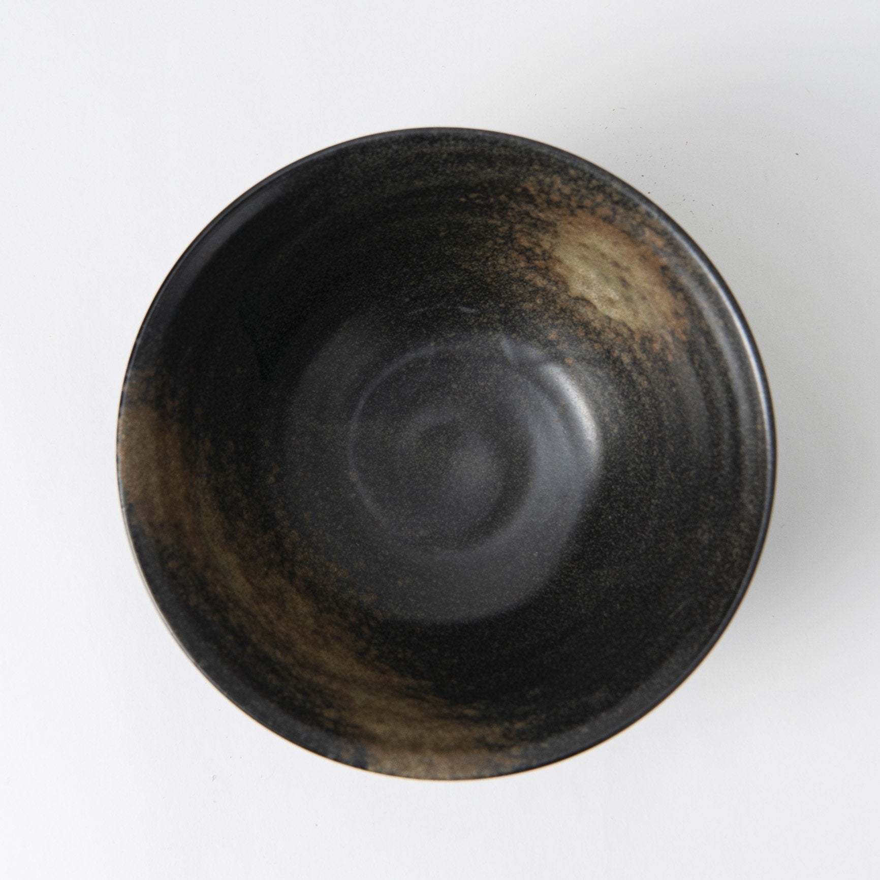 This regular-sized mino ware ramen bowl features an elegant design with light brown circular patterns set against a black background, representing the moon and its gentle glow in the night sky. The overall look is chic and exudes a sense of refinement.
