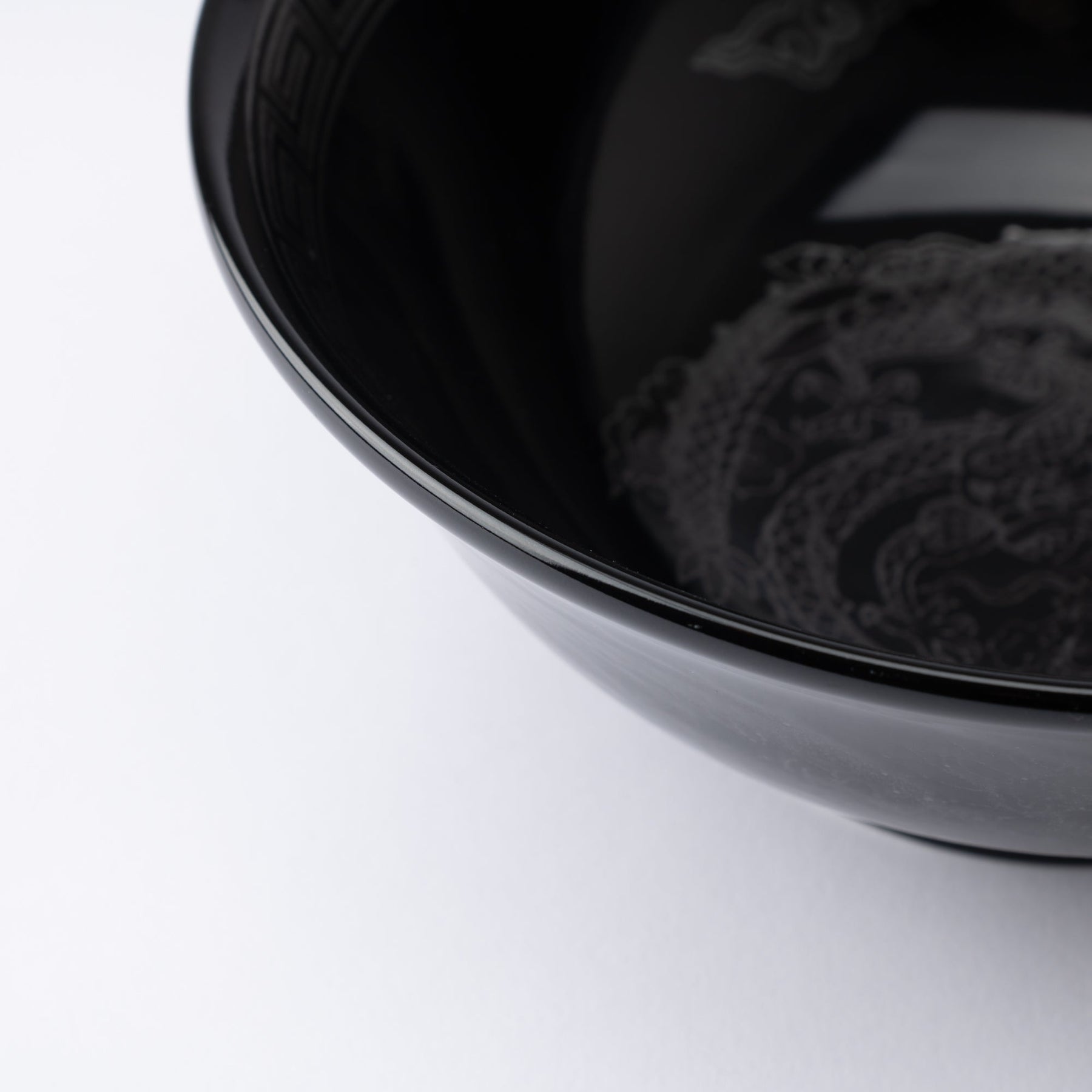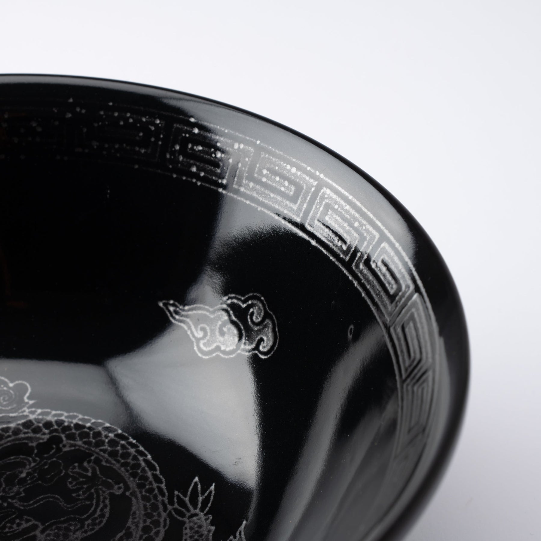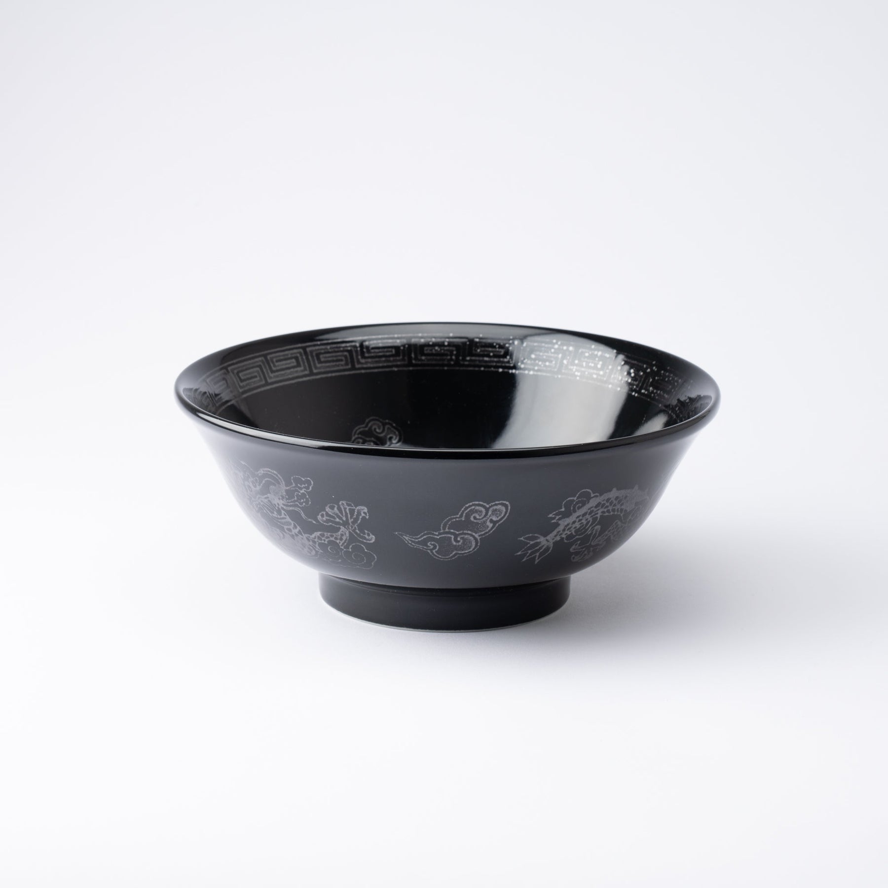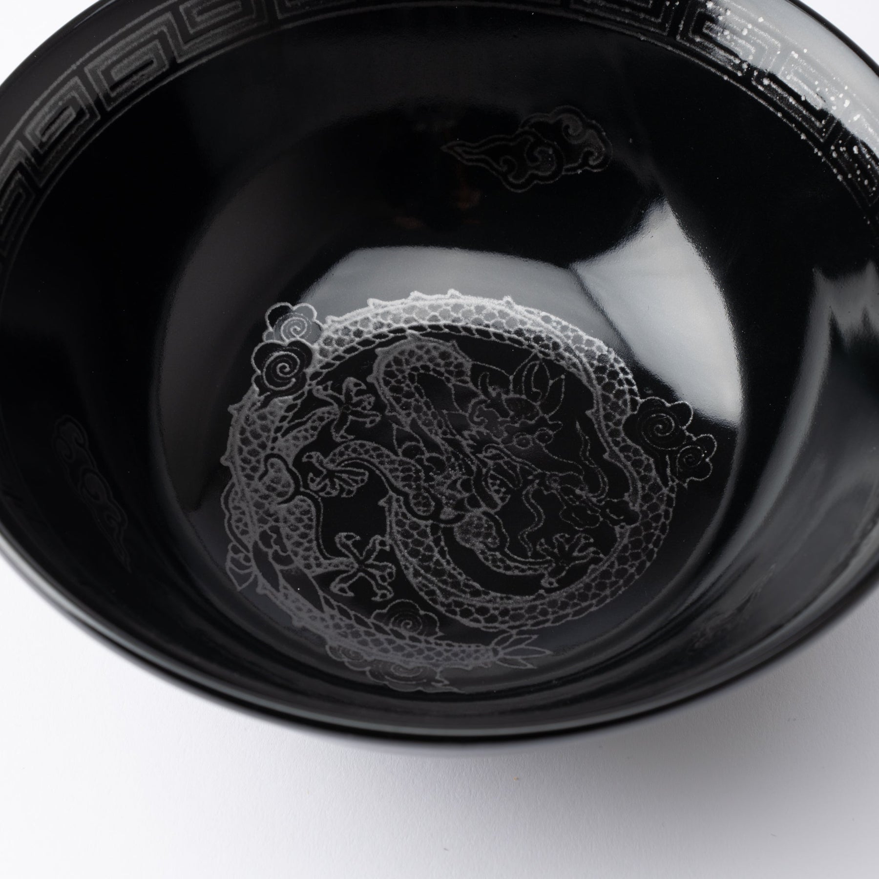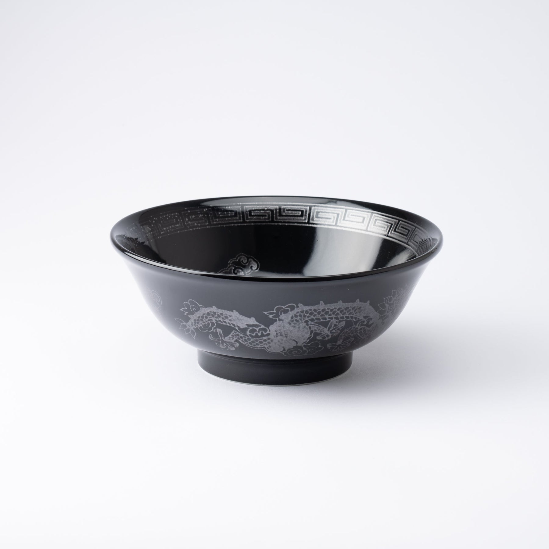 This regular-sized Mino ware ramen bowl features a glossy black background with an elegant silver dragon painted on the sides and bottom. In Asian cultures, the dragon is an auspicious creature, symbolizing nobility and good fortune. Inside the bowl, the square spiral pattern, known as raimon in Japanese, is a traditional Chinese lightning design symbolizing the wonders of nature—a motif commonly found on Japanese ramen bowls.