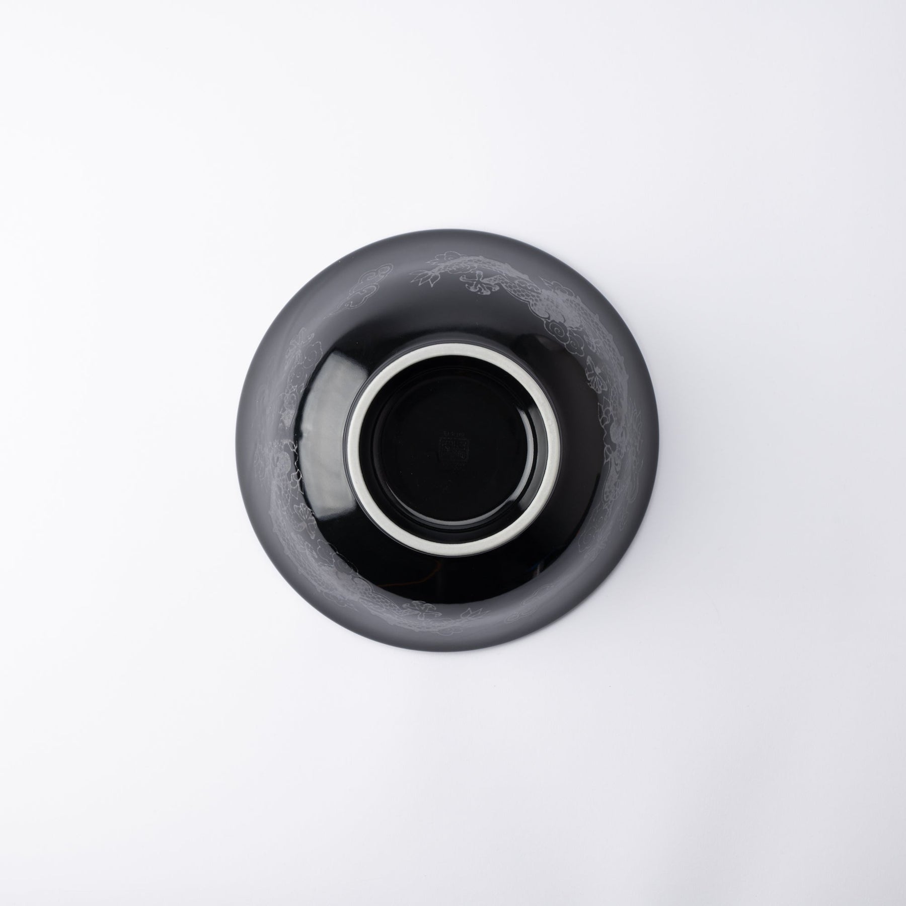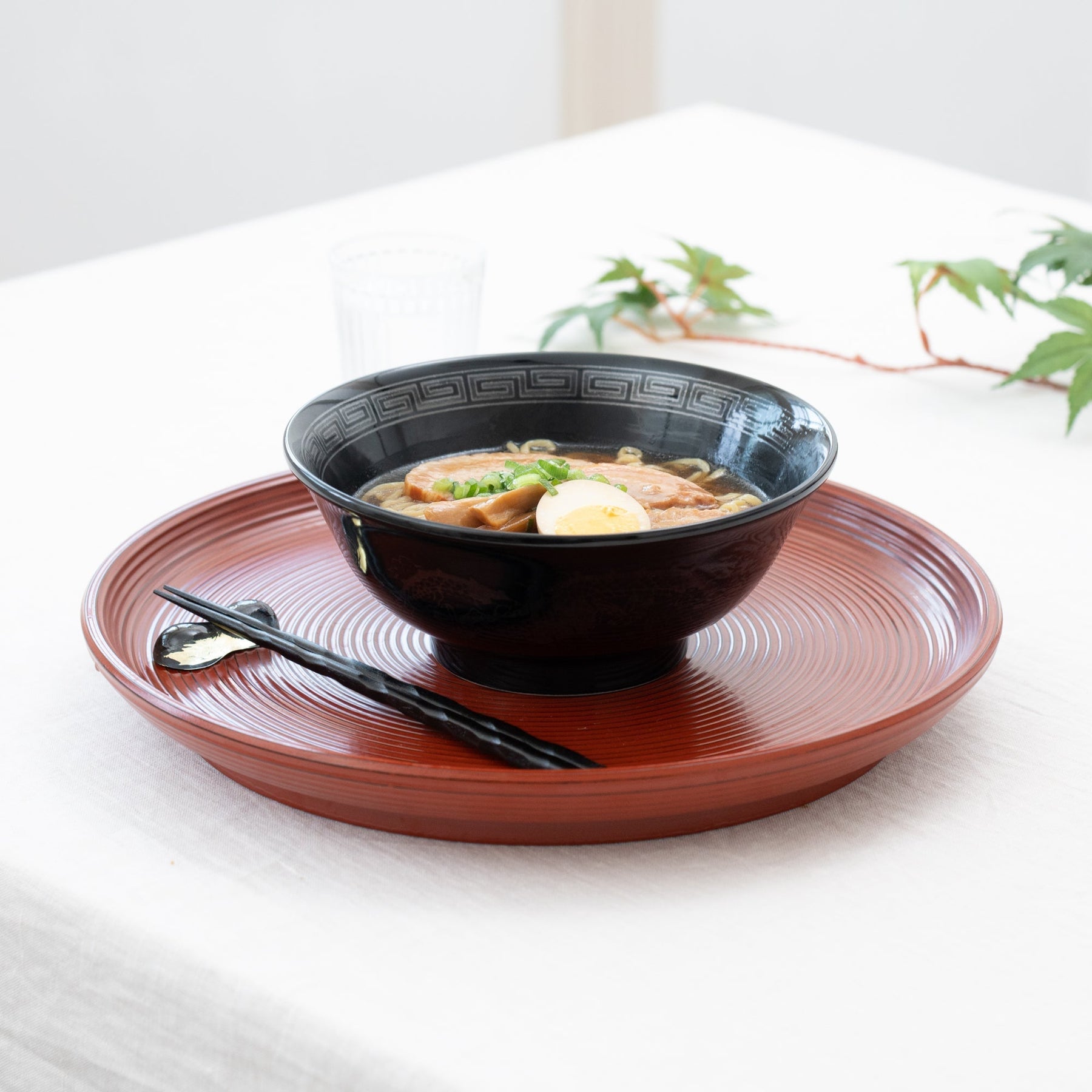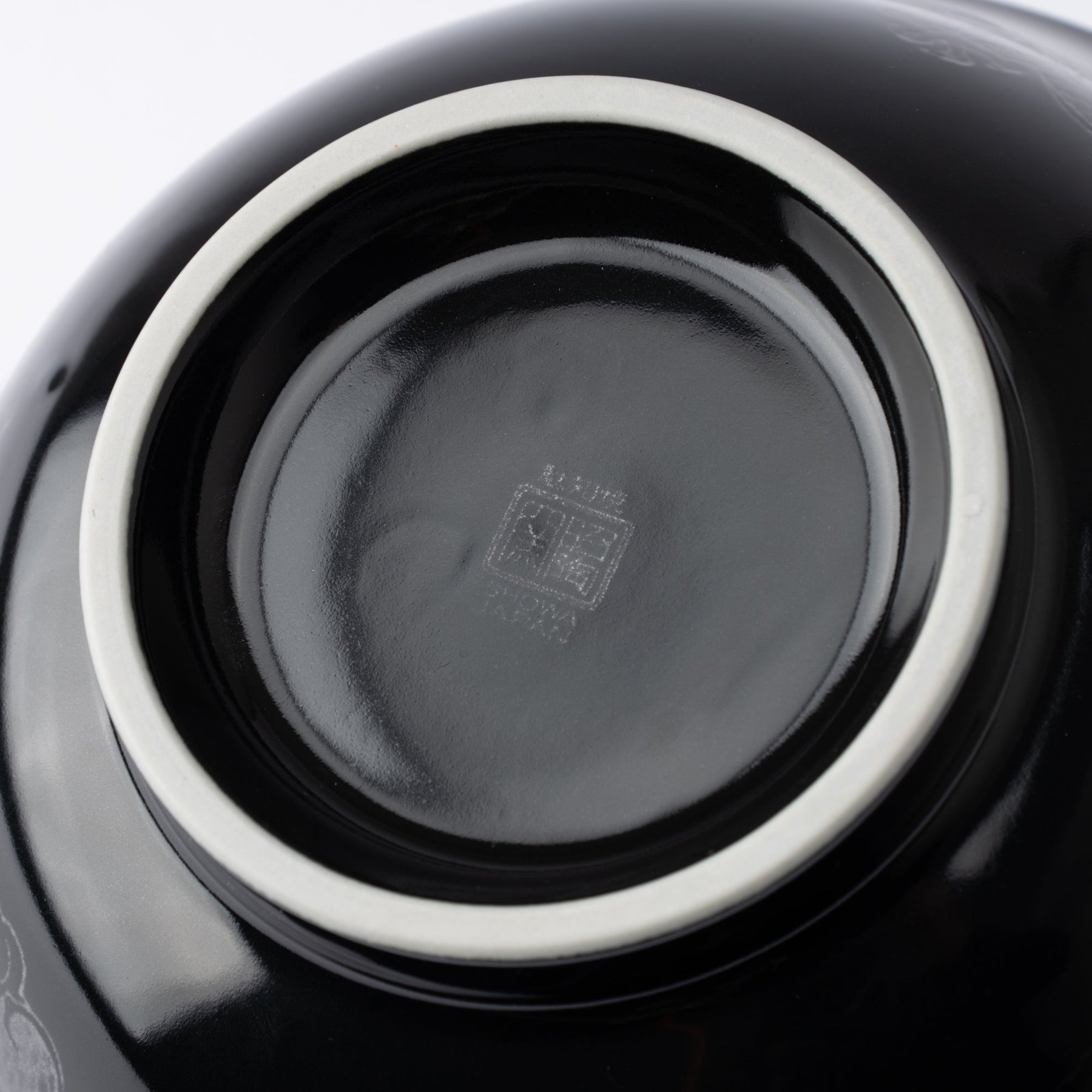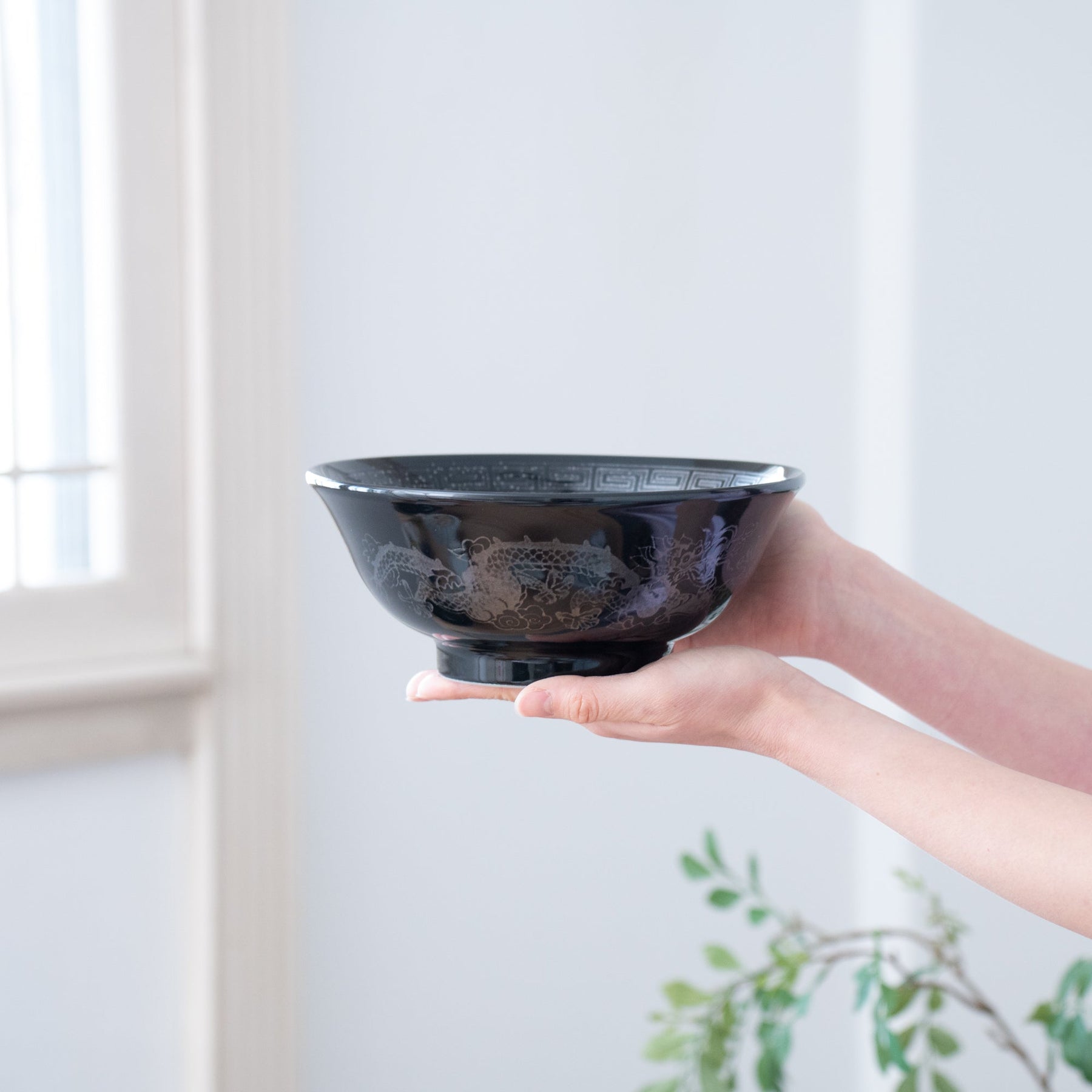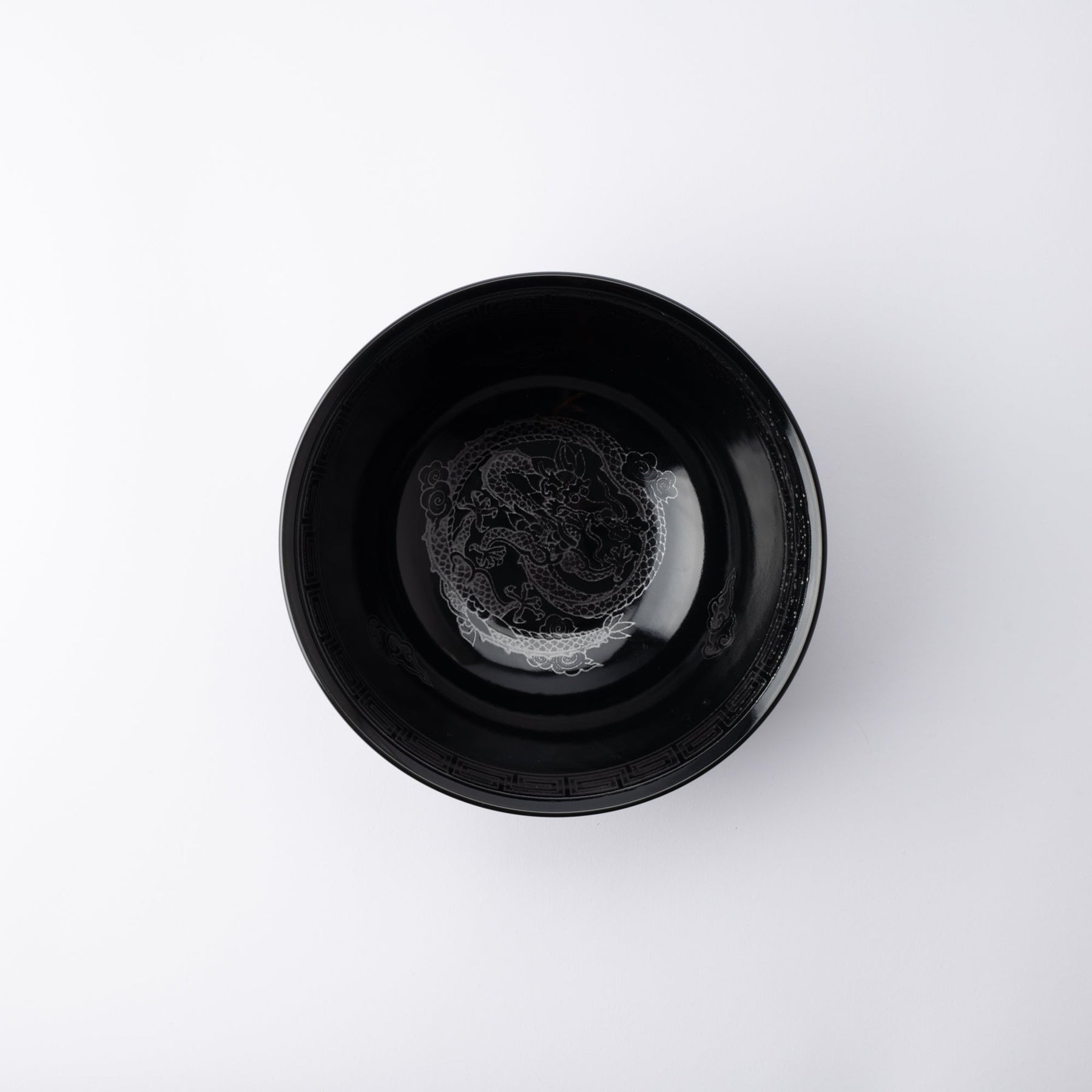 This regular-sized Mino ware ramen bowl features a glossy black background with an elegant silver dragon painted on the sides and bottom. In Asian cultures, the dragon is an auspicious creature, symbolizing nobility and good fortune. Inside the bowl, the square spiral pattern, known as raimon in Japanese, is a traditional Chinese lightning design symbolizing the wonders of nature—a motif commonly found on Japanese ramen bowls.