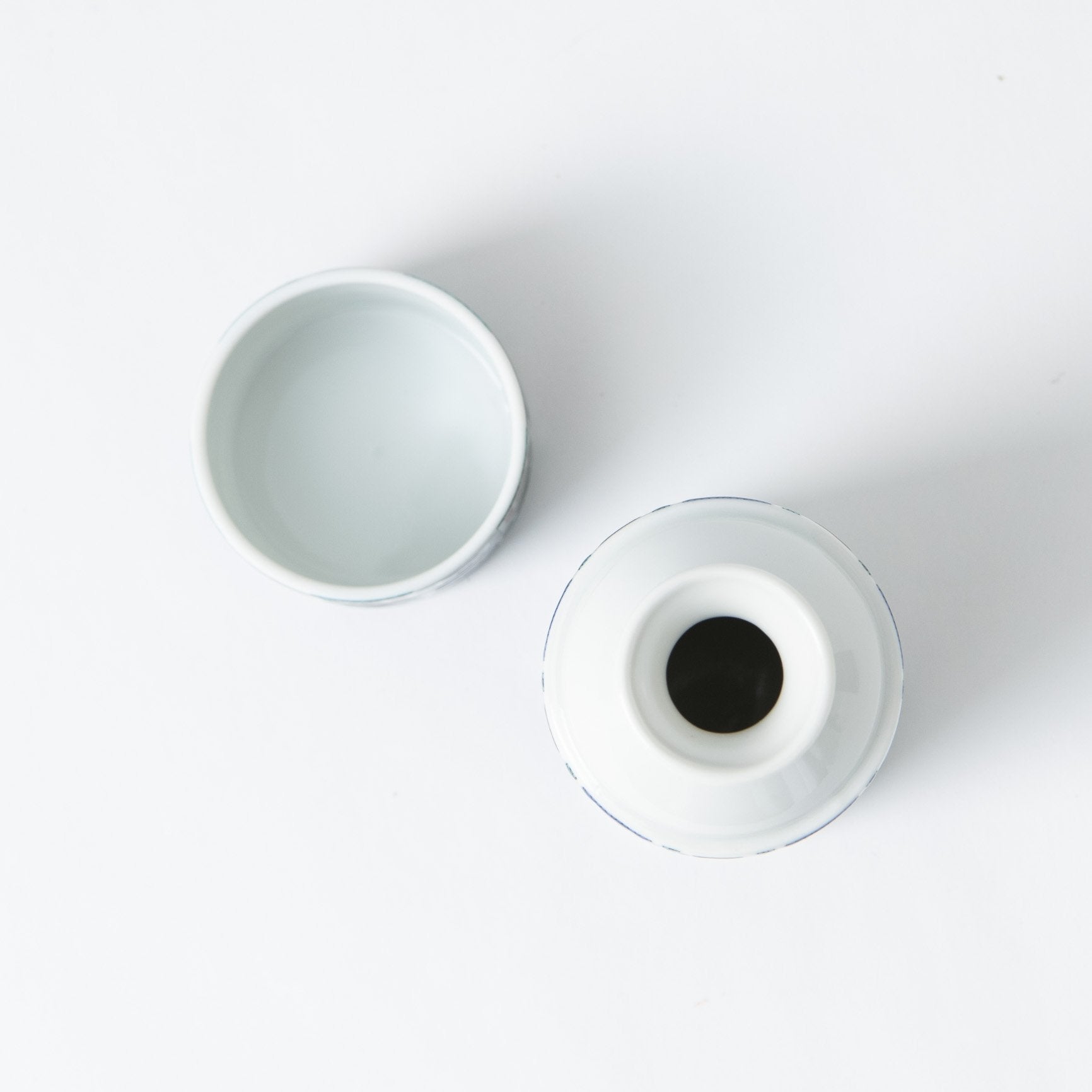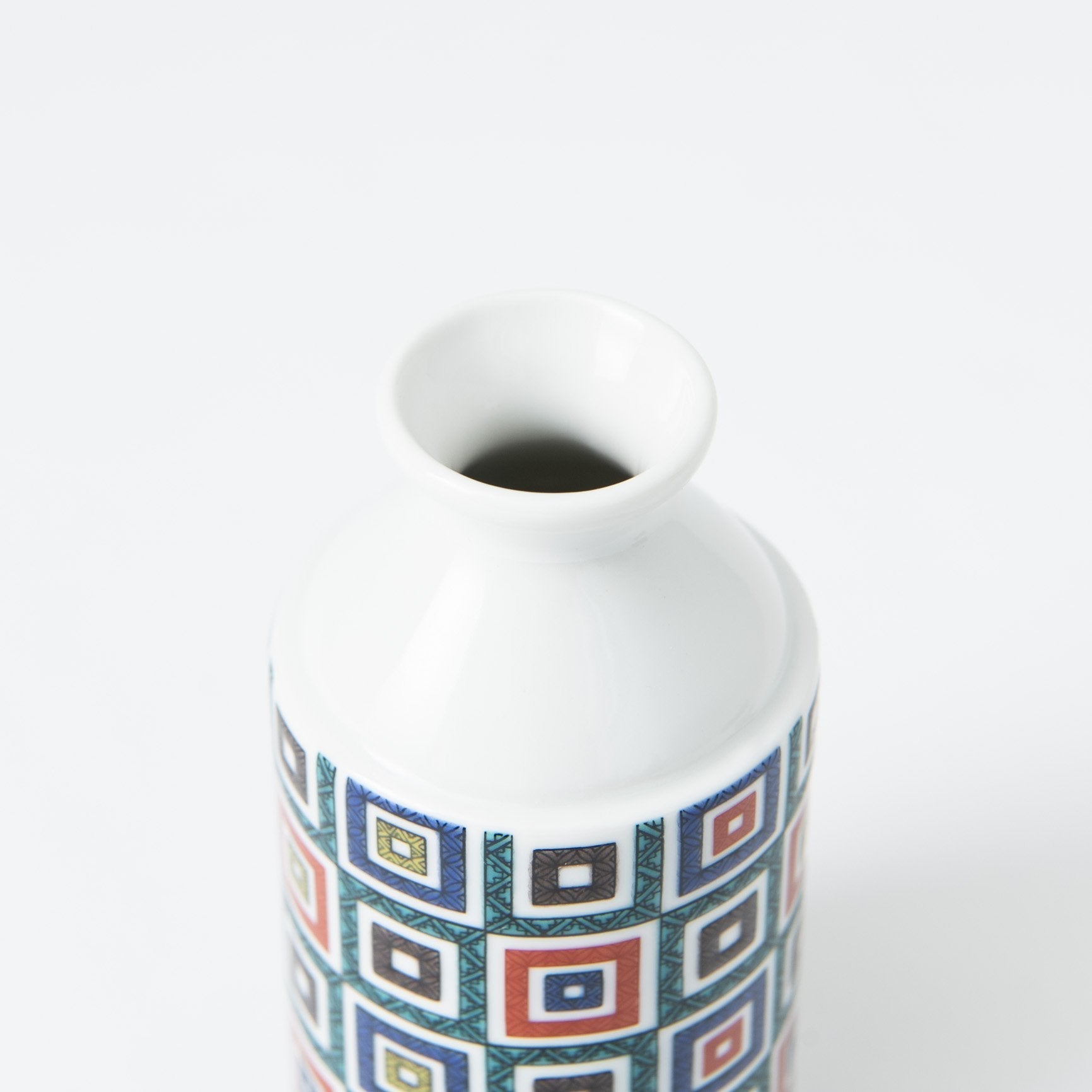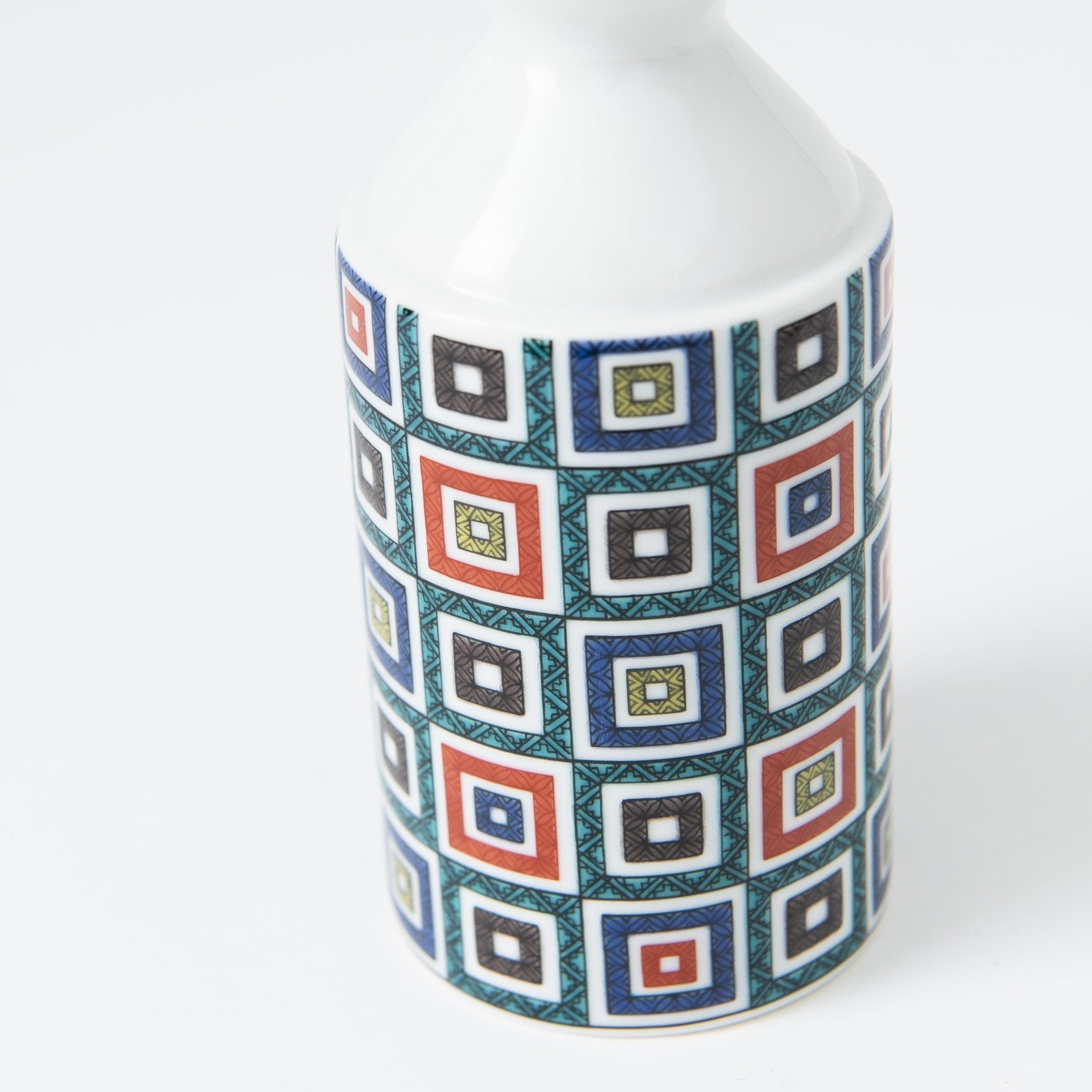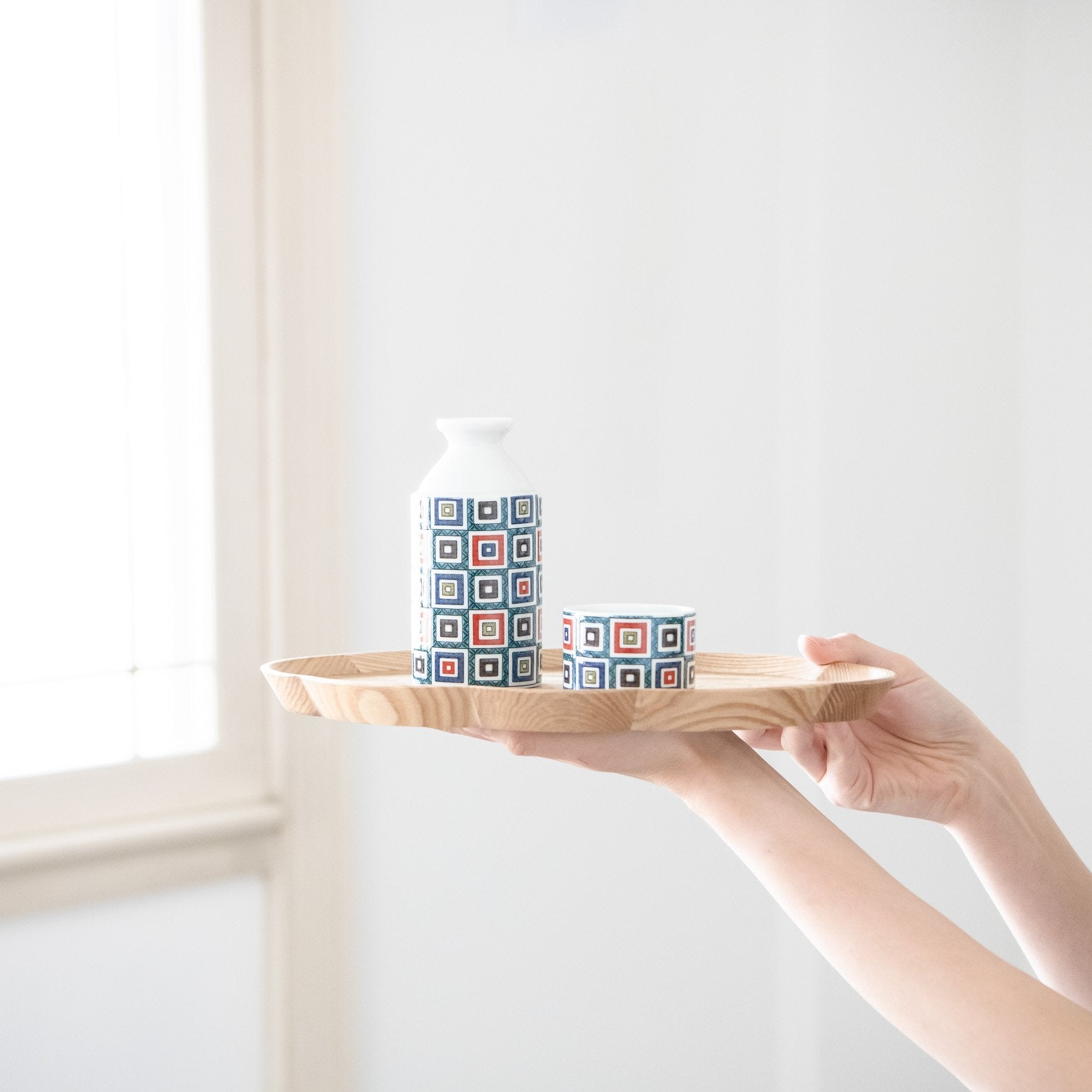 This is a unique sake set that features a Japanese traditional tile pattern. The cap of the tokkuri (Japanese sake carafe) can be used as a sake cup.