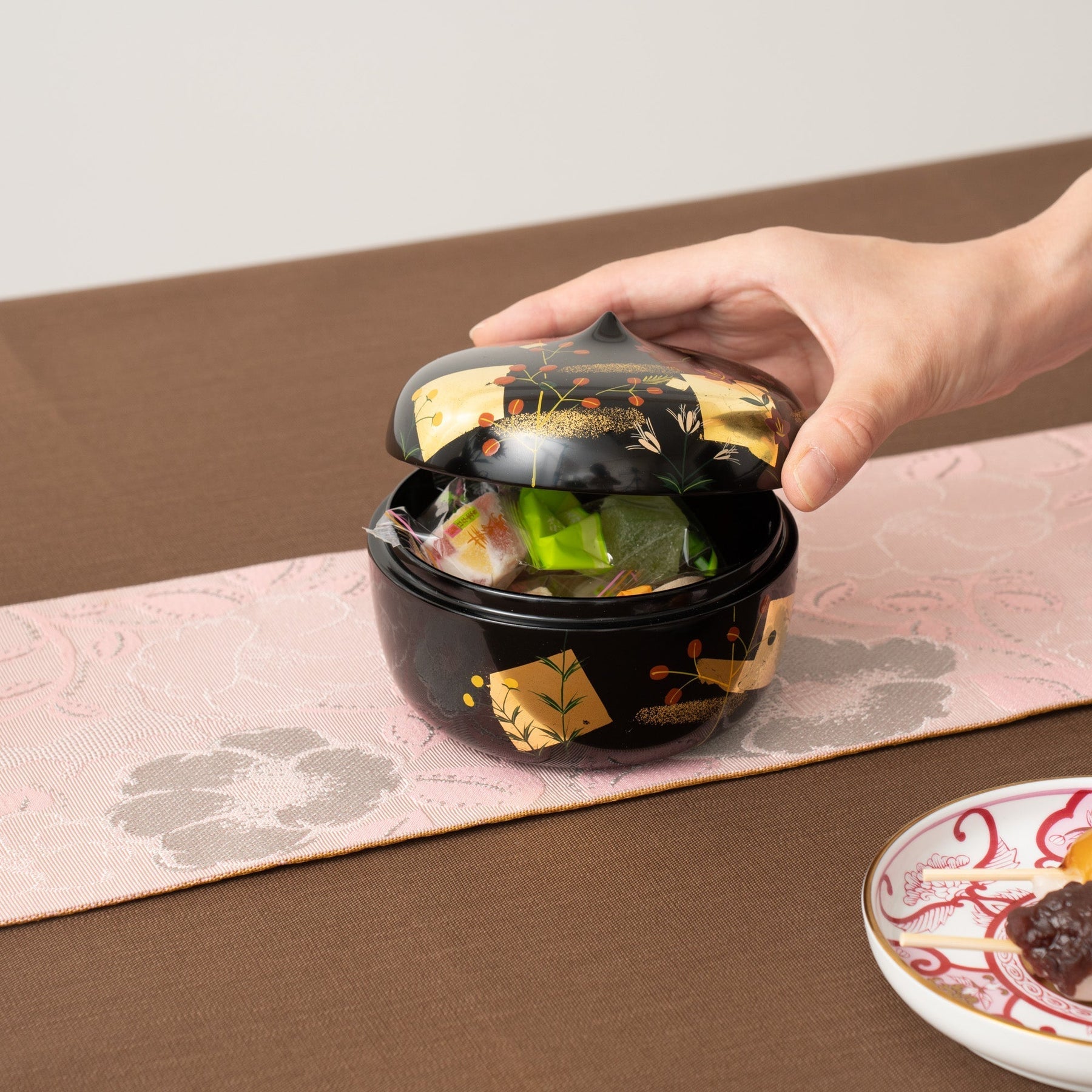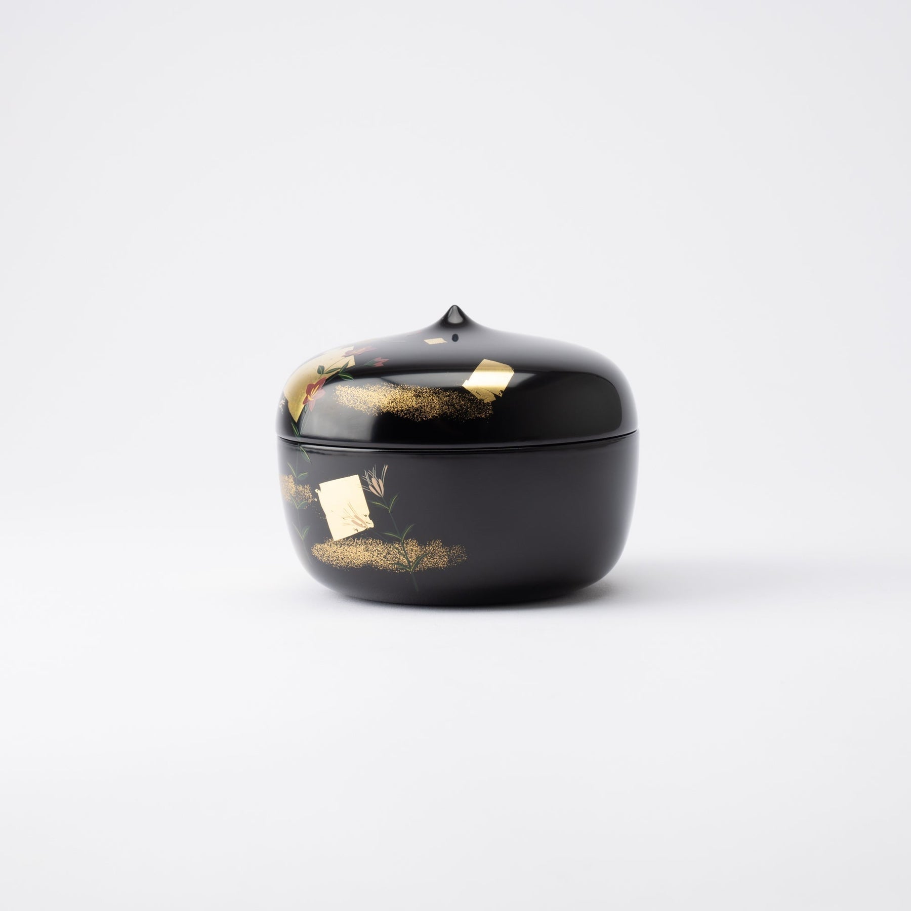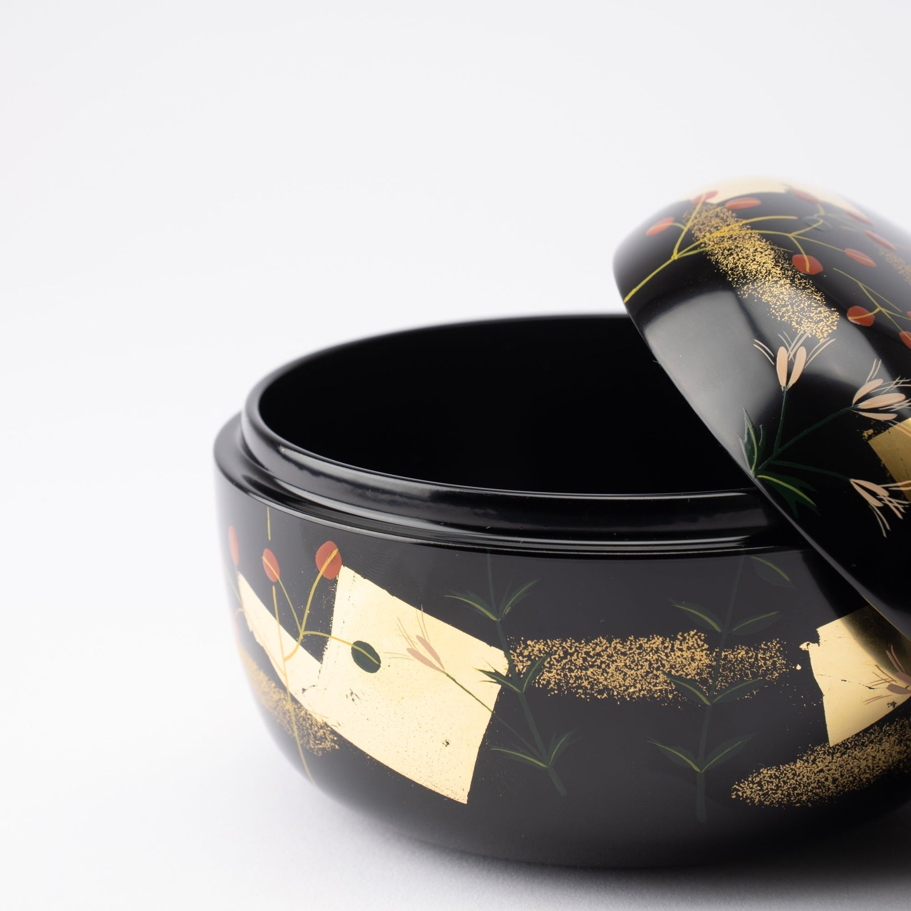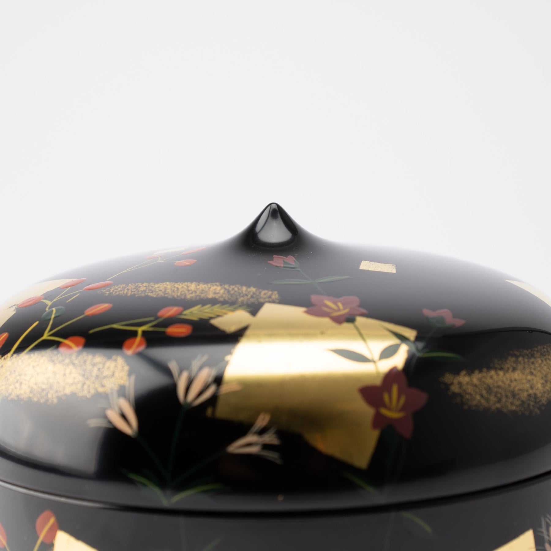 This Yamanaka lacquerware candy box has a unique design in a shape of "Houju". Lacquered in chic black lacquer, it is elegantly decorated with autumn flowers such as bellflowers in gold.