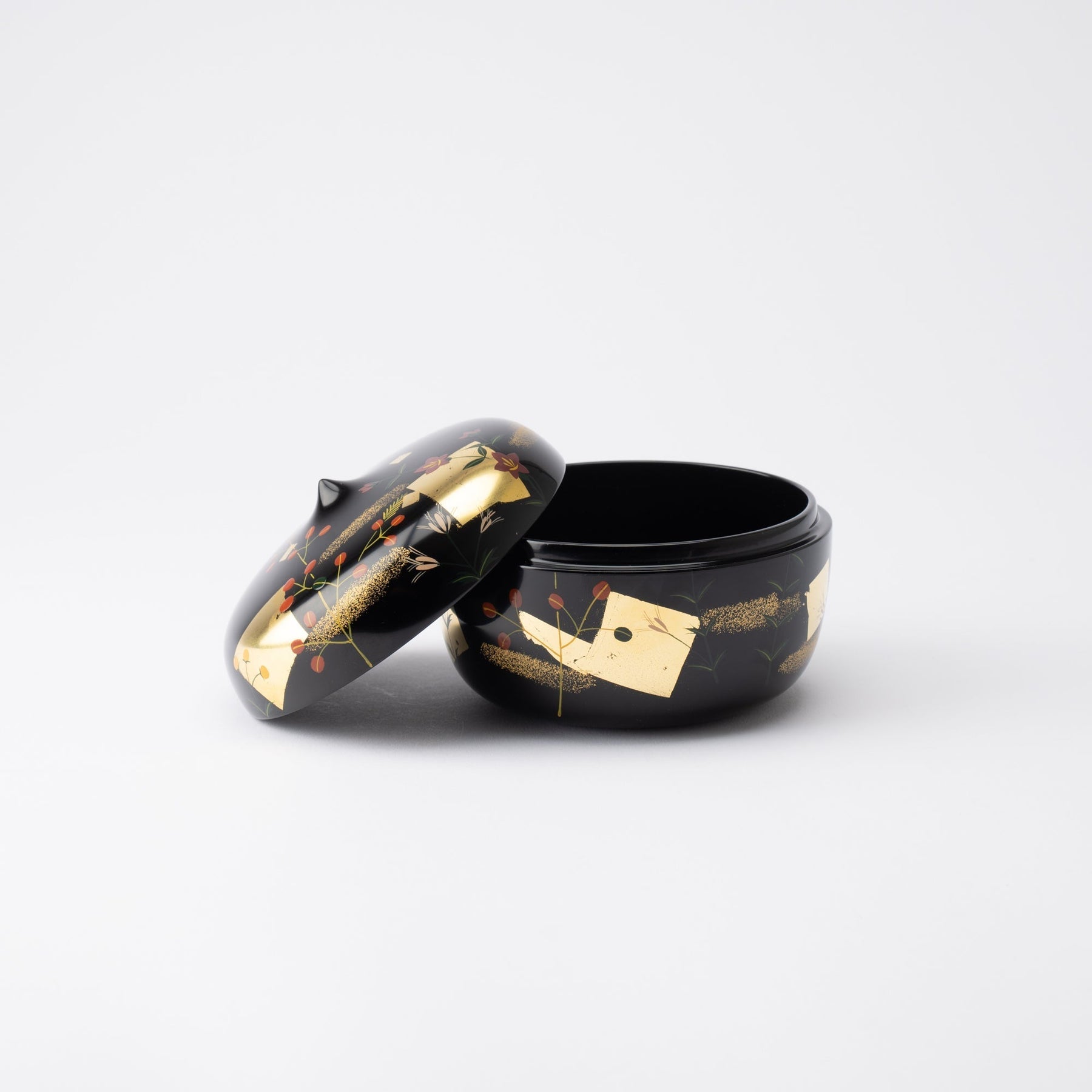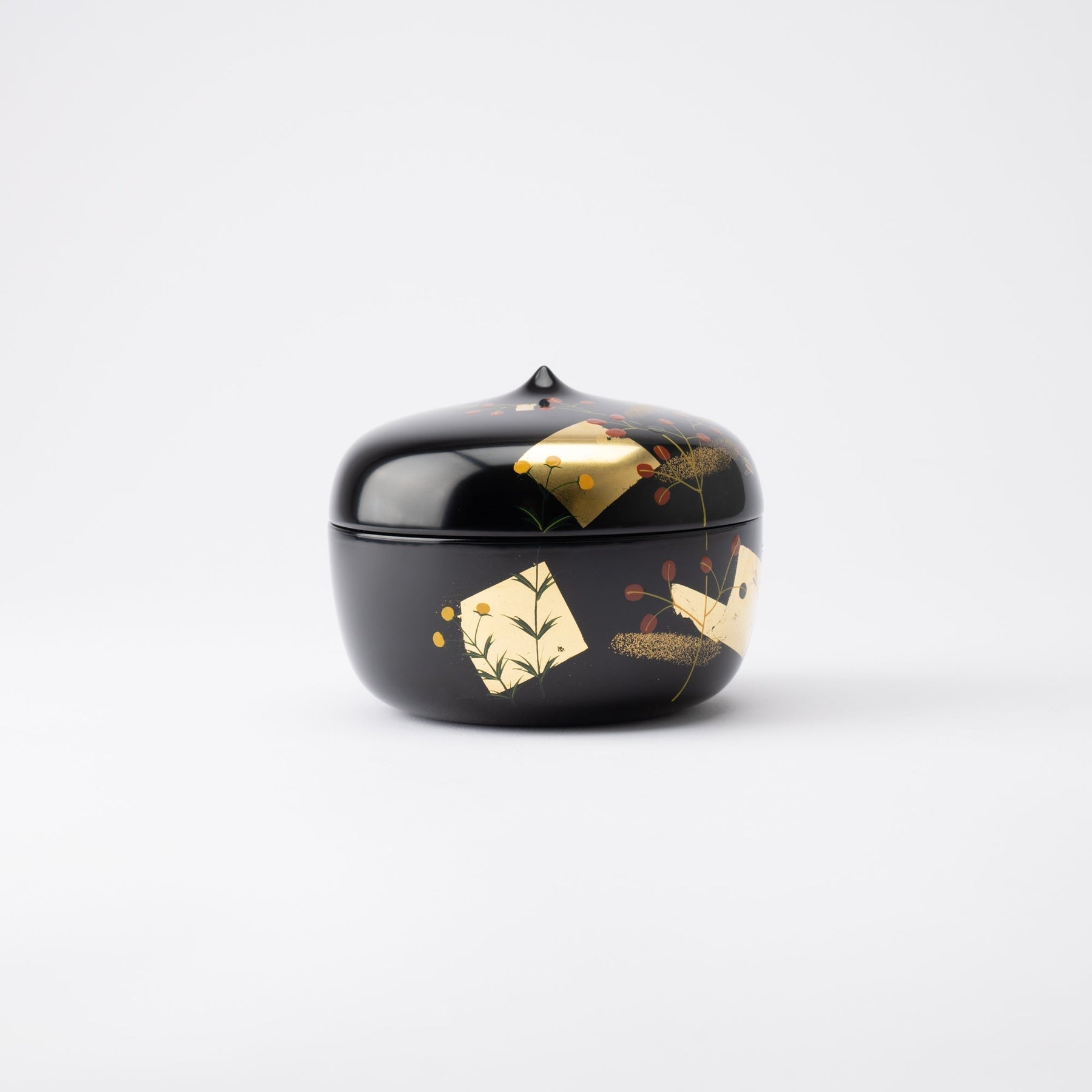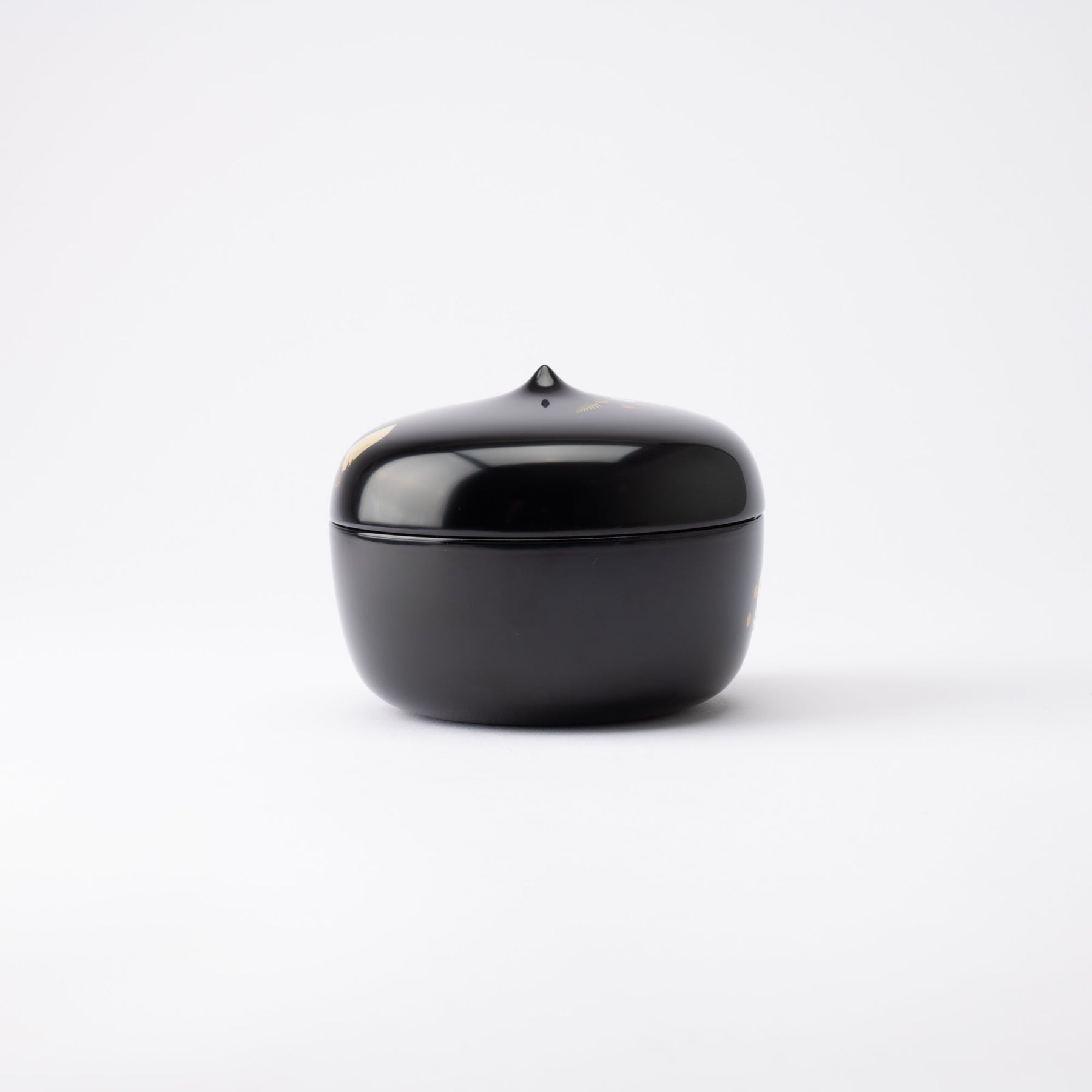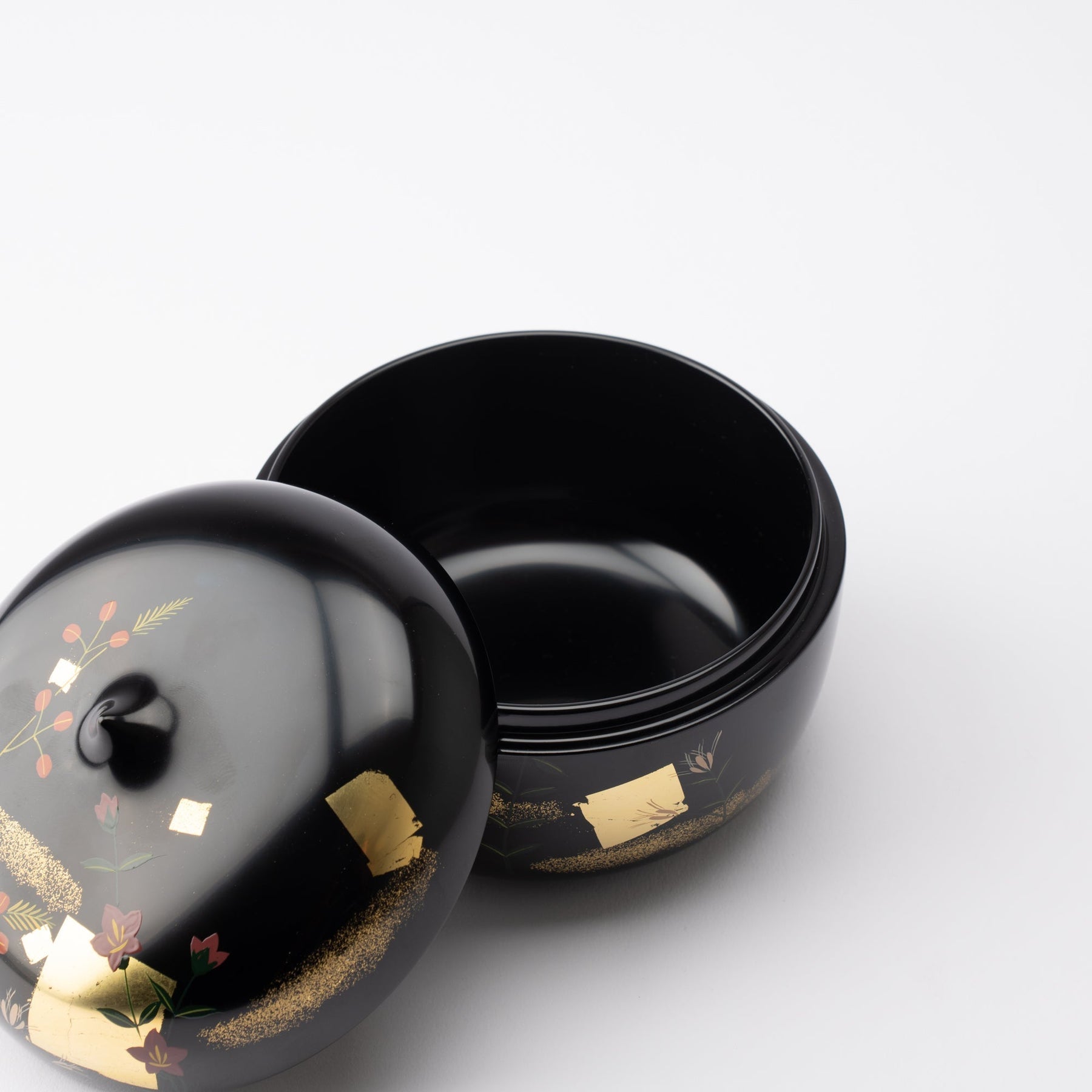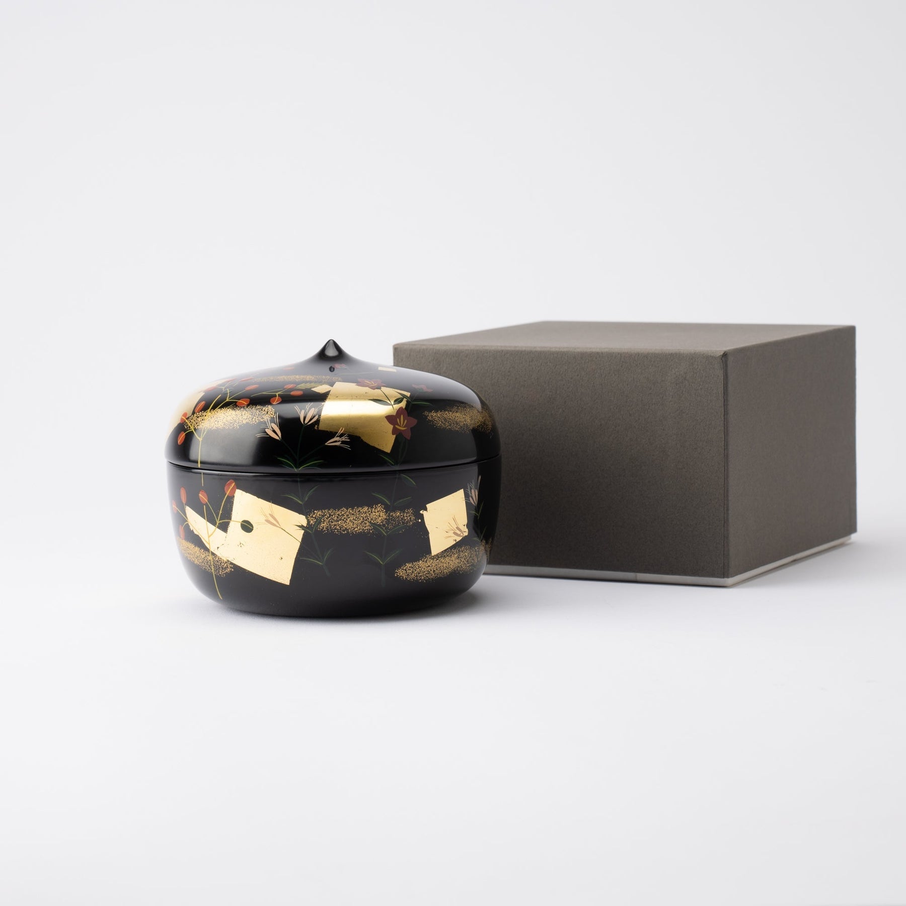 This Yamanaka lacquerware candy box has a unique design in a shape of "Houju". Lacquered in chic black lacquer, it is elegantly decorated with autumn flowers such as bellflowers in gold.