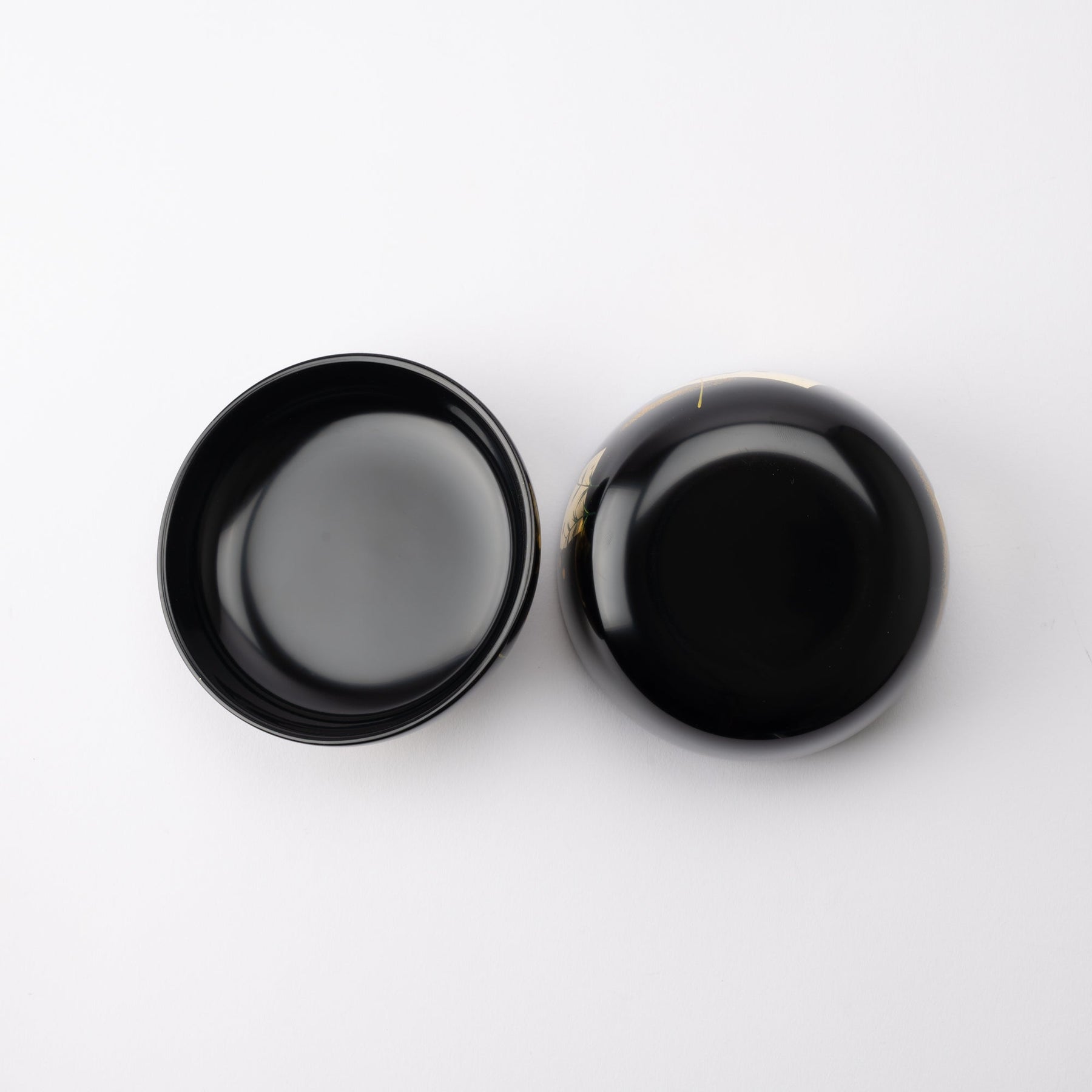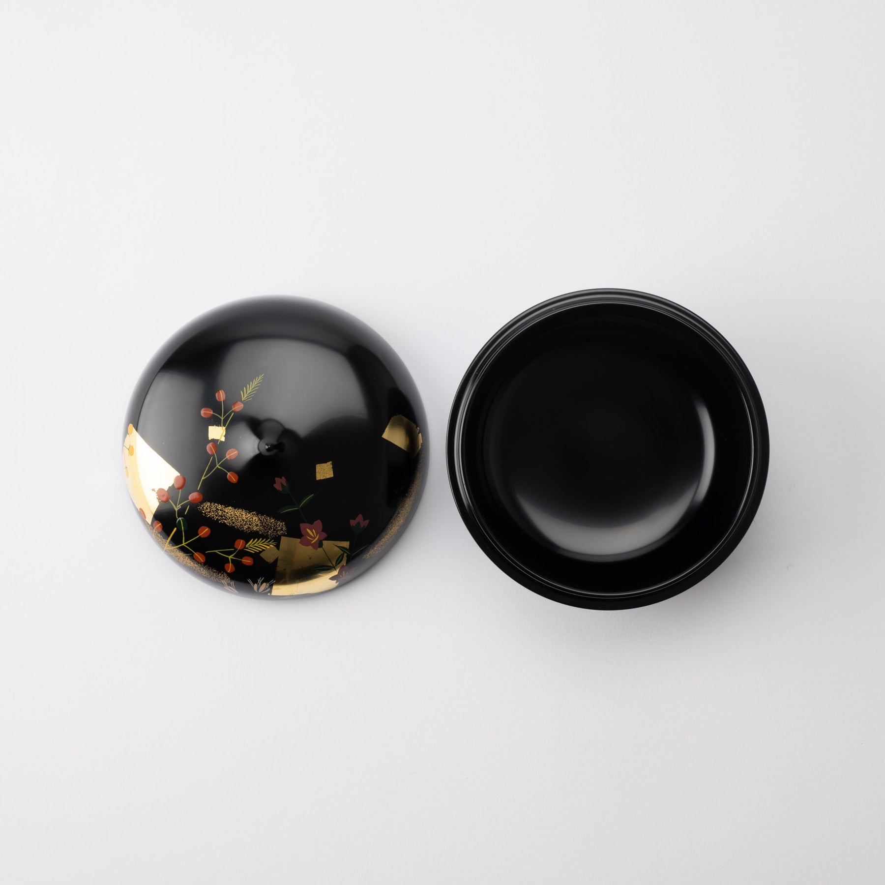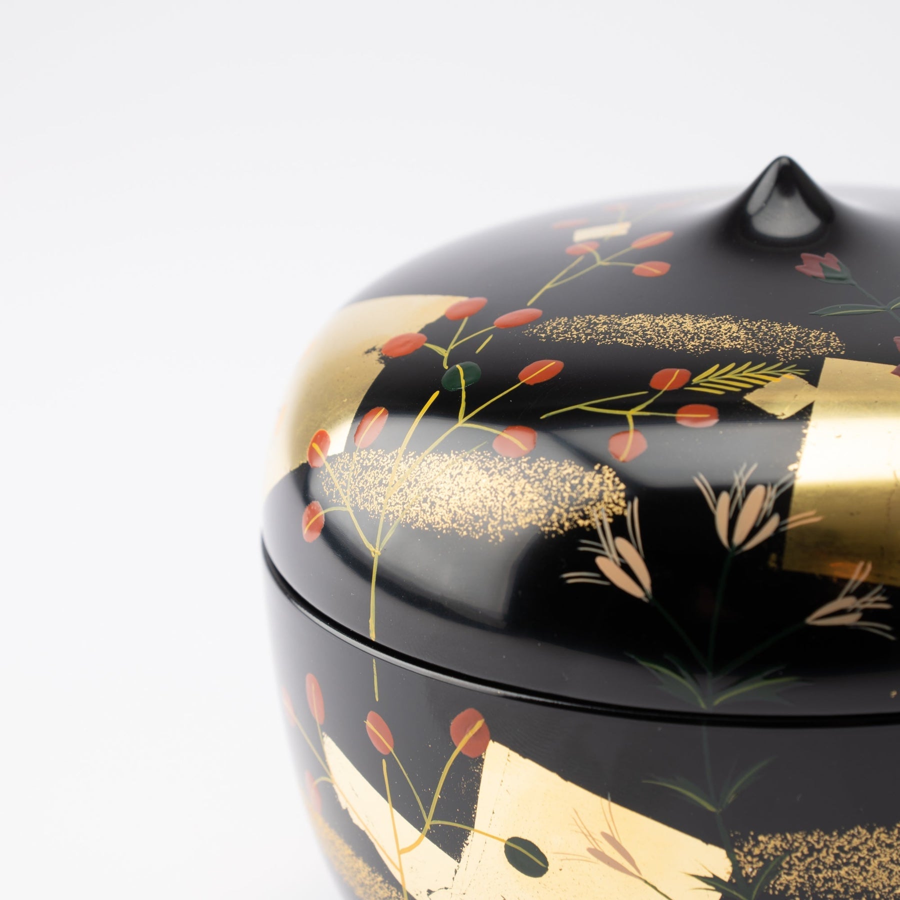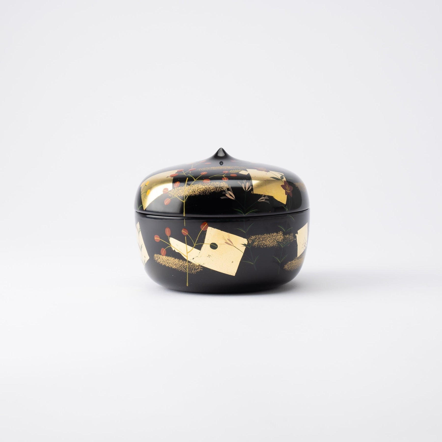 This Yamanaka lacquerware candy box has a unique design in a shape of "Houju". Lacquered in chic black lacquer, it is elegantly decorated with autumn flowers such as bellflowers in gold.