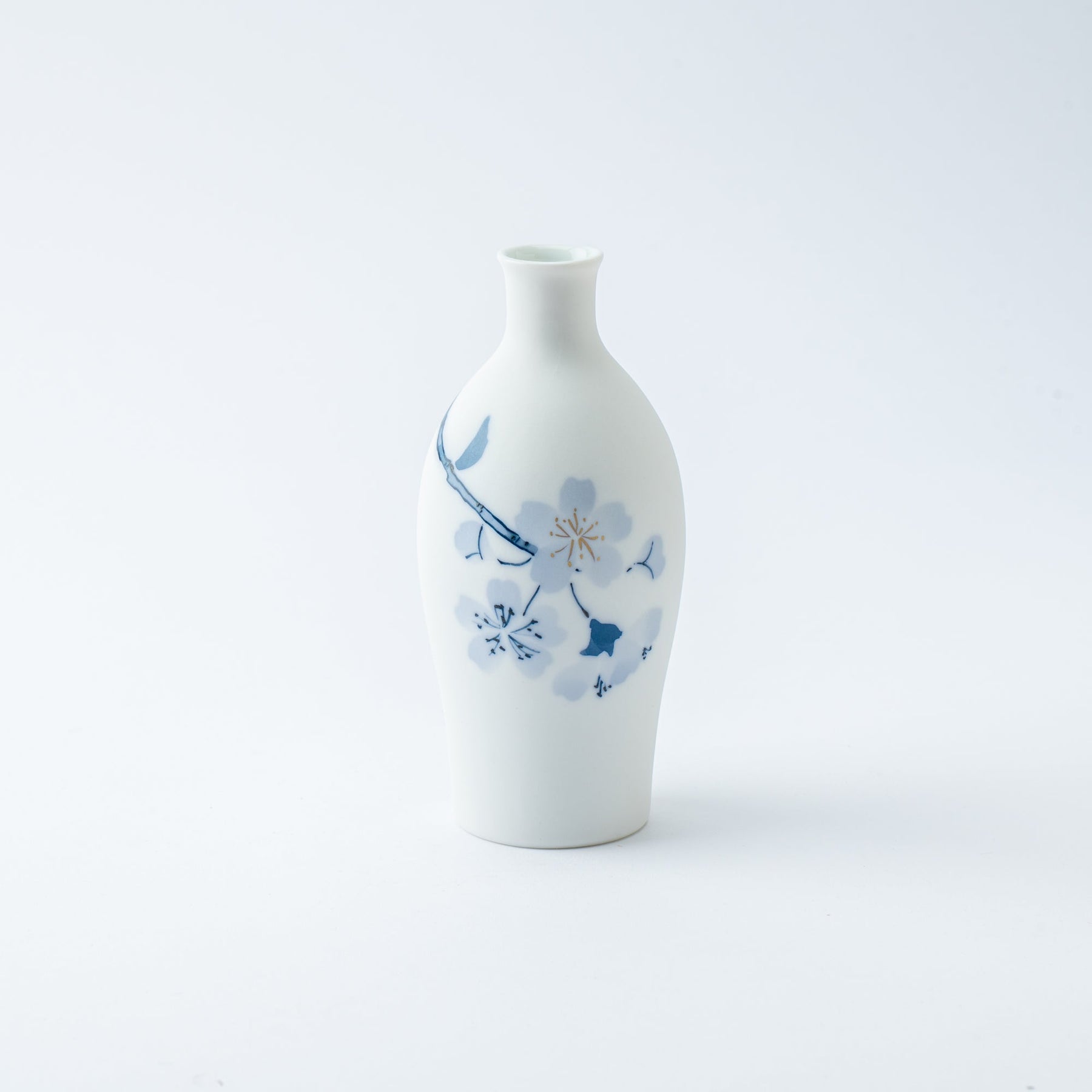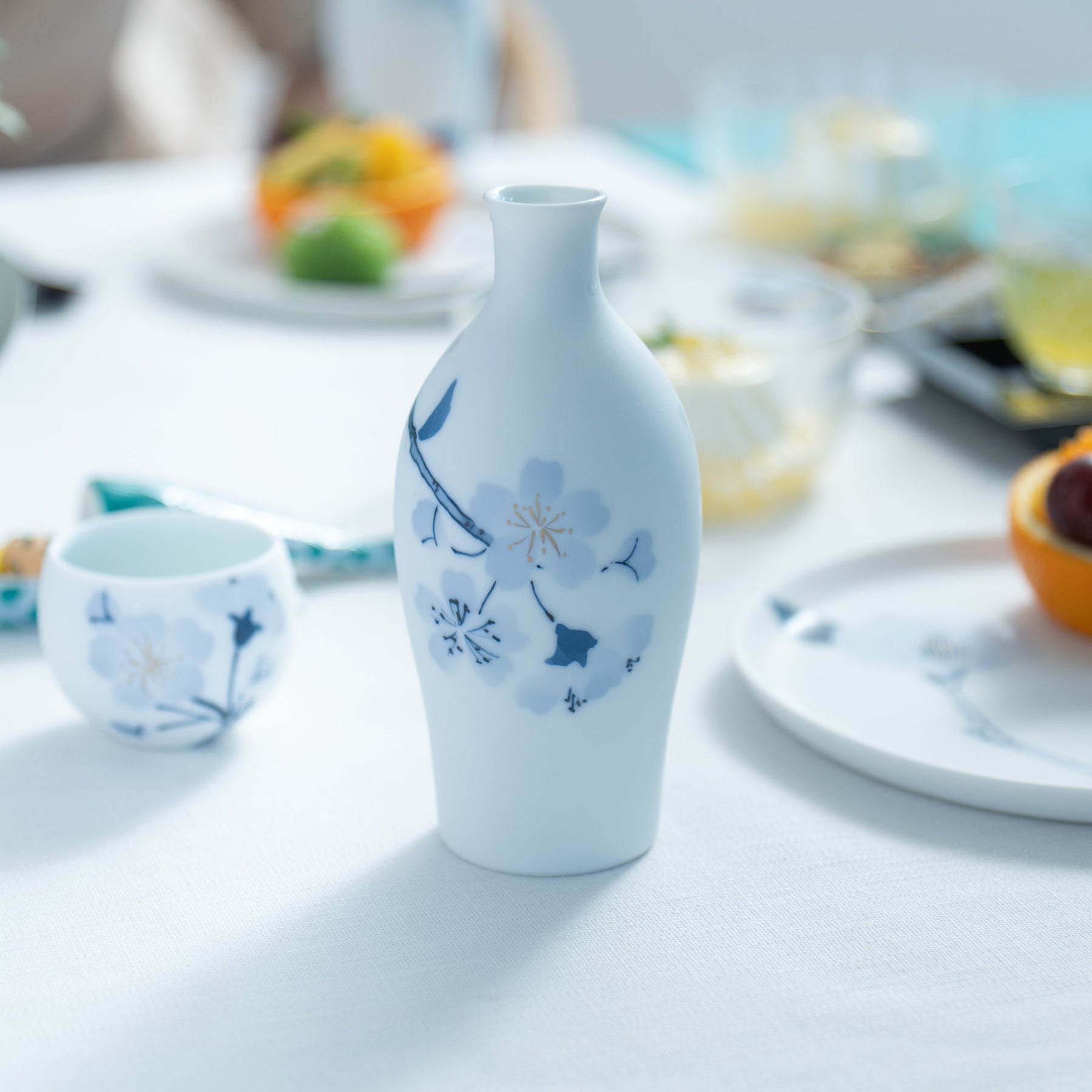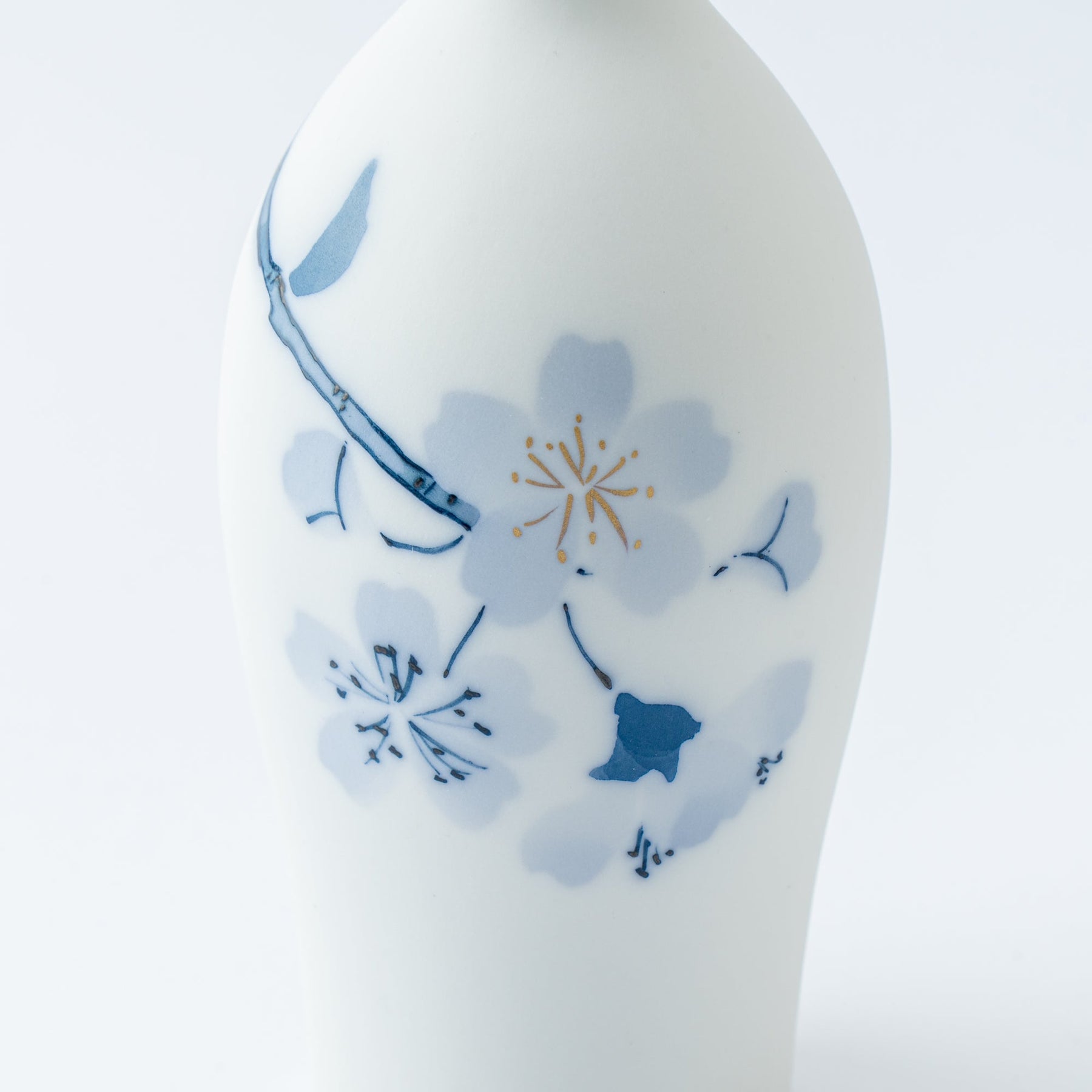 Bring the beauty of sakura to your sake moments with this porcelain tokkuri sake carafe, adorned in Seto sometsuke—the iconic blue-and-white style. A single branch of cherry blossoms wraps gently around its surface, with pale petals unfolding beside touches of gold and deep cobalt, an original design made for MUSUBI KILN. The rounded form fits comfortably in the hand, offering a quiet elegance with each pour.
