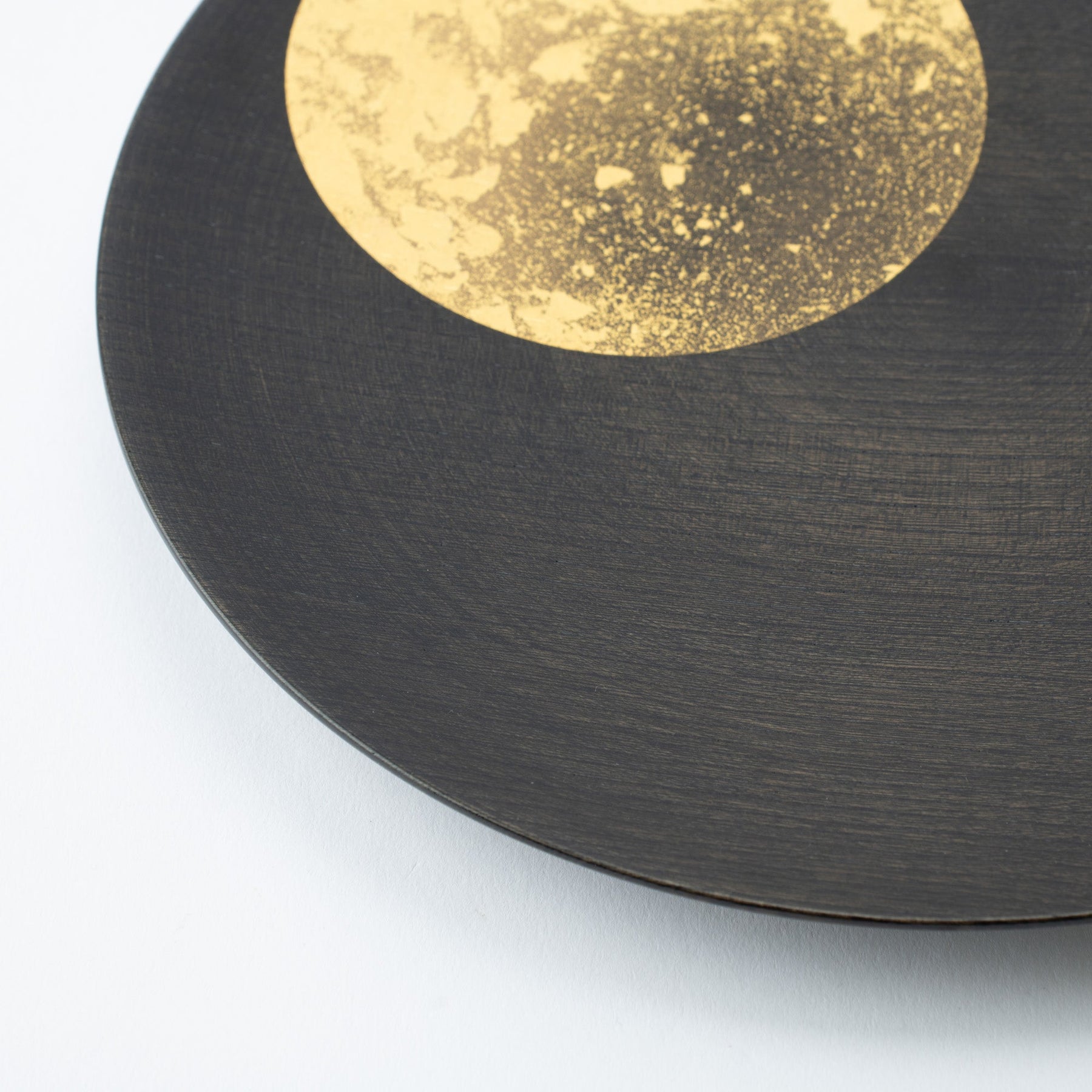 This plate is 24 cm (9.4 in) in diameter and is extremely light and easy to hold. The deep black color of the lacquer exquisitely expresses the calmness of a night sky. The delicate and random haze of the full moon is depicted by gilded gold leaves. The sharp silhouette of the moon on the black lacquer will add a modern touch to your dining table.
