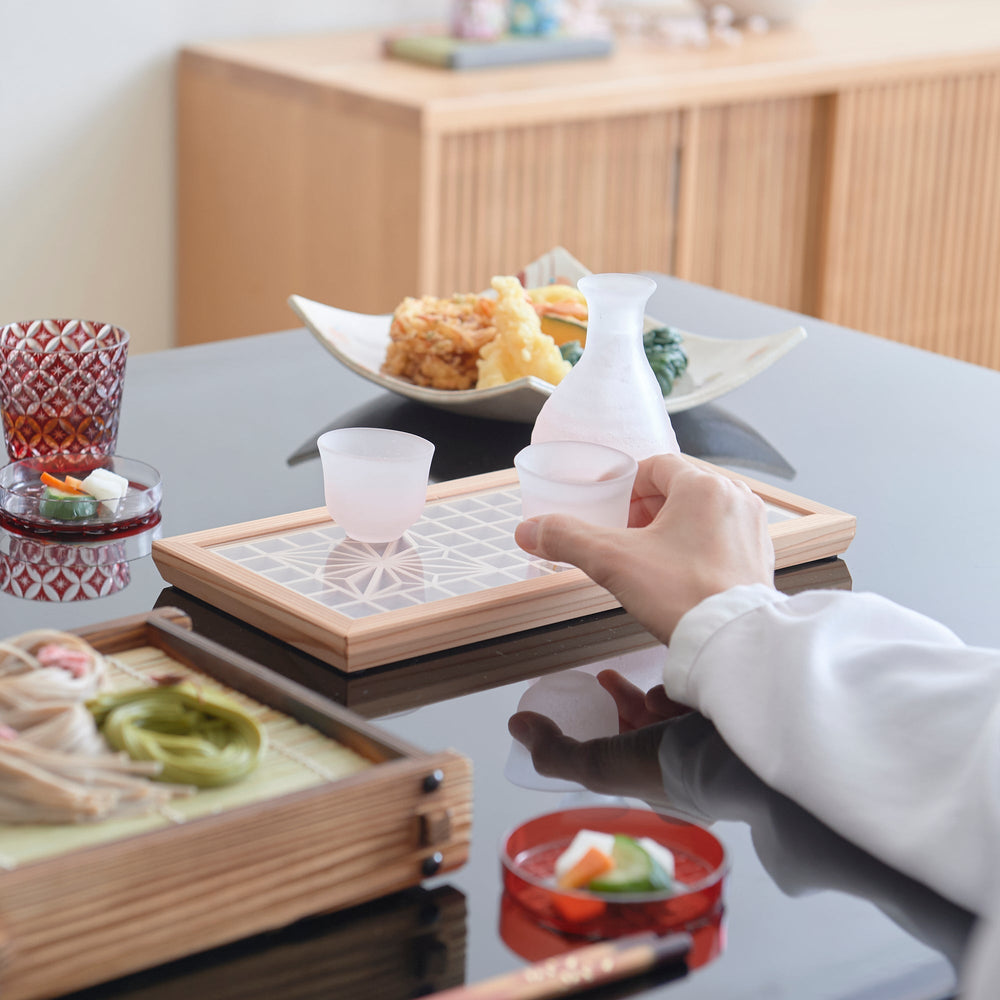As its name, fubuki, meaning snowstorm, suggests, this sake set captures the swirling beauty of snow in its design. The set includes a tokkuri (Japanese sake carafe) and two cups, each meticulously crafted to evoke the tranquil imagery of a winter storm.