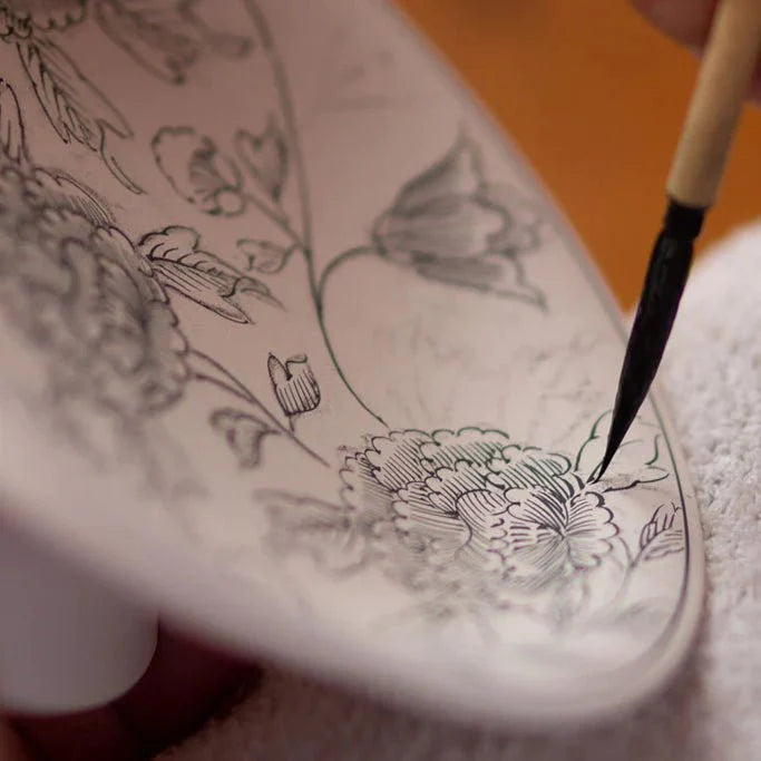The shades of blue display an exquisite gradation, painted carefully by skilled craftspeople using brushes soaked in cobalt pigment, allowing the dye to flow naturally onto the porcelain. The dye "sinks" into the clay creating a gentle and soft shade of blue. The outlines are drawn swiftly with precision and care using soft and fine brushes along the contours of the flowers and leaves.